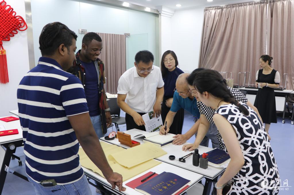 程启民先生向36365官网国际教育学院捐赠了巨幅隶书作品《沁园春·雪》、个人隶书字帖集《中华字经》10本;张子君先生捐赠了《孔子拜学》国画、孟仲恺先生捐赠了《墨竹清香》国画作品。国际教育学院院长张素风向程启民、张子君、孟仲恺三位民间艺术家颁发“国际学生中国传统文化指导教师”聘书。