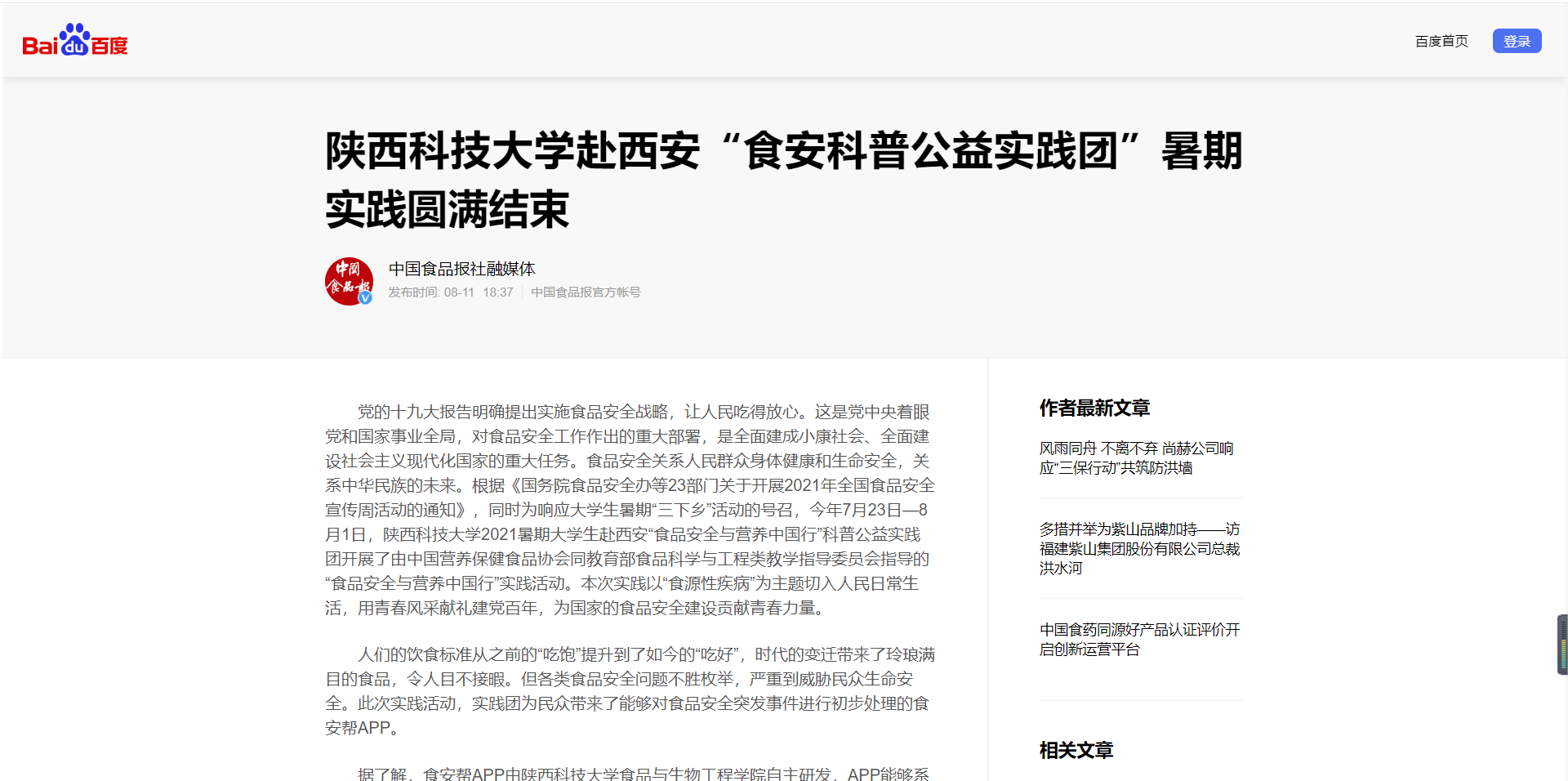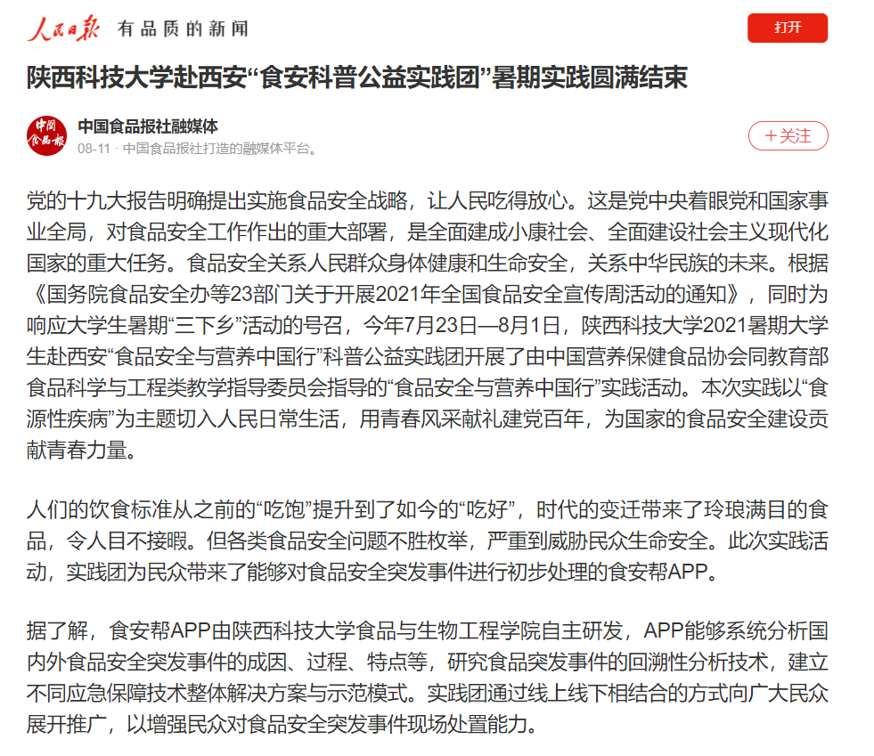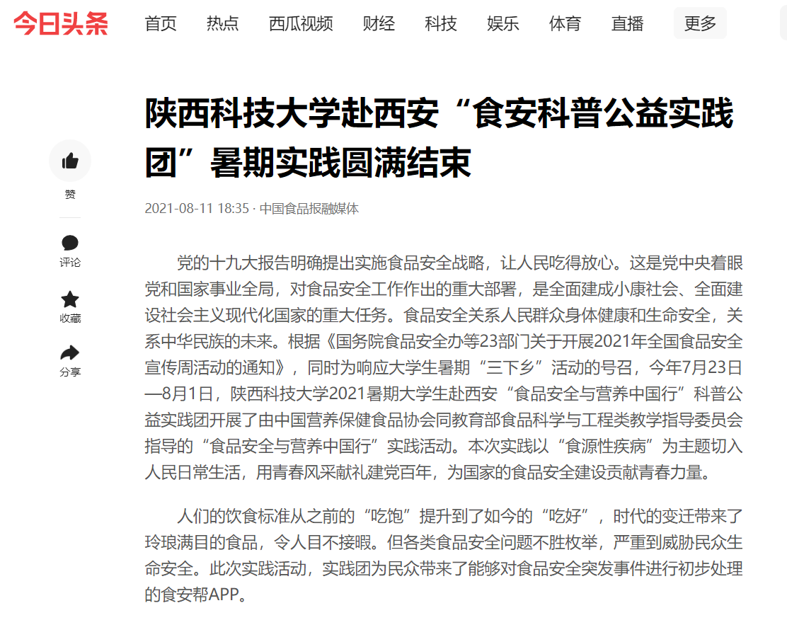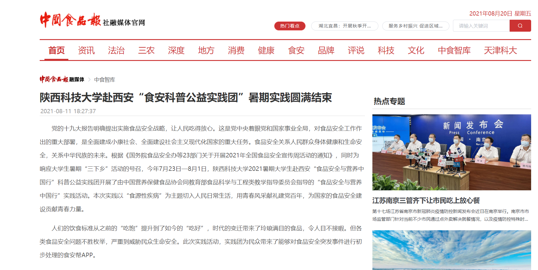 近日,食品学院“食品安全与营养中国行”科普公益实践团的实践成果在人民日报、中国食品报、今日头条、新浪网、搜狐网、百度APP、一点咨询等多家媒体发布。报道以《bet36365路检测中心赴西安“食安科普公益实践团”暑期实践圆满结束》为题,详细介绍了实践团的工作内容及实践成果。