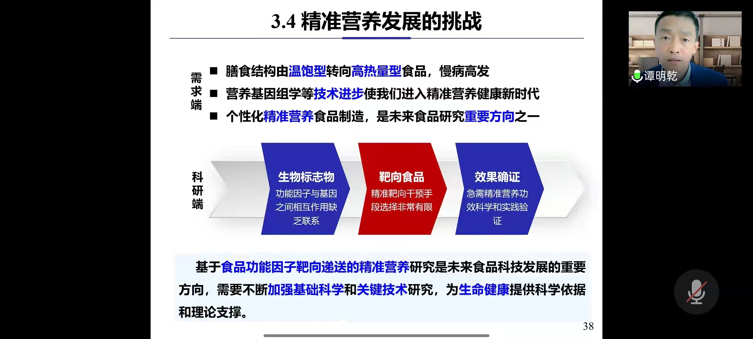 谭明乾教授从我国人民的膳食结构与营养需求切入,介绍了“精准营养”的内涵,阐述了现阶段精准营养研究手段与干预手段,肯定了利用食品科技保障人民营养健康课题的必要性。他通过阐述食品功能因子与载体的相互作用及稳态化机制、构建食品功能因子可视化示踪方法,阐明了担载的功能因子进入机体后的吸收及释放规律,初步揭示了部分食品功能因子的原集和转运机制。他还介绍了精准营养产业发展动态及其发展所面临的挑战。