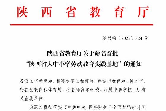 2020年3月,中共中央、国务院印发《关于全面加强新时代大中小学劳动教育的意见》,要求全面贯彻党的教育方针,坚持立德树人,把劳动教育纳入人才培养全过程,贯通大中小各学段,促进学生形成正确的世界观、人生观、价值观。2021年8月,为扎实推进陕西省大中小学劳动教育实践基地建设,加快构建德智体美劳全面培养的教育体系,陕西省决定评选命名首批陕西省大中小学劳动教育实践基地。