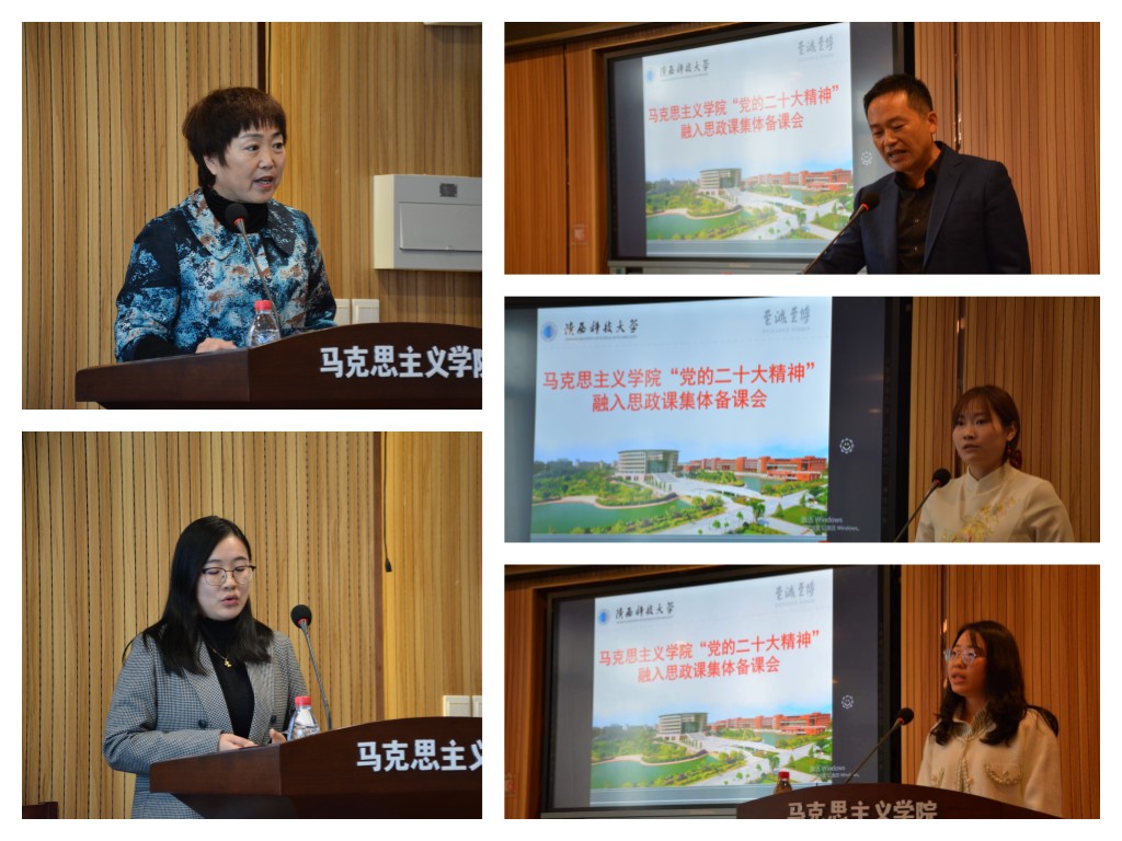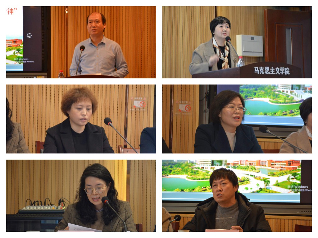 会上,各教研部主任结合每门思政课的内容和特点,着重从理论阐释、原理运用、事例分析、情境课堂、实践研学等多个角度,汇报了推动党的二十大精神融入思政课的基本思路和方法路径。“原理”教研部主任文敏提出,要准确把握和领会党的二十大报告的新思想、新观点、新论断,结合马克思主义基本原理的整体性,突出重点,讲授关键性、实质性的内容。“概论”教研部主任王贞茹认为,要找准党的二十大报告与“毛泽东思想和中国特色社会主义理论体系概论”和“习近平新时代中国特色社会主义思想概论”两门课程在教材内容上的契合点,选择生动鲜活的案例,让党的二十大精神“带着温度”进教案、进课堂、进学生头脑。“纲要”教研部主任徐瑞仙提出,通过历史知识融入、观点佐证融入、党史故事宣讲融入、专题式研究融入等“四个融入”,推动党的二十大精神进课堂。“德法”教研部师俊华主要介绍了理论融入、实践融入、社会服务与组织安排等4个方面的具体举措,着重说明了以“拍”微型电影、“辩”人生哲理、“寻”行业楷模、“访”红色遗迹、“做”志愿服务、“写”感恩书信、“讲”依法治国为主题的实践教学融入。针对形势与政策课程所具有的时事政治性强、内容变化快、持续周期长的特点,“形策”教研部主任周鹏认为,要在学深悟透党的二十大精神的基础上,贯通历史叙事、学理阐发和现实关照,找准融入的切入点与侧重点,综合运用文献教学法、互动式教学、探究式教学模式等多种教学方法,带领学生深入感受党的创新理论的魅力。