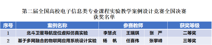 第二届全国高校电子信息类专业课程实验教学案例设计竞赛决赛由教育部高等学校电子信息类专业教学指导委员会、国家级实验教学示范中心联席会电子学科组共同主办,北京航空航天大学承办,于10月23日通过腾讯会议方式在线上举行,西安交通大学、西安电子科技大学、西北工业大学、兰州大学、电子科技大学、重庆大学、天津大学、哈尔滨工业大学、浙江大学、国防科技大学、上海交通大学、南京航空航天大学等122所高校的151个实验案例参加决赛。36365官网李慧贞教师团队的“北斗卫星导航定位虚拟仿真实验”案例获全国决赛二等奖,杨帆教师团队的“基于多网融合的物联网应用系统设计实验”案例获全国决赛三等奖,与往届相比,获奖质量和数量均有提升。