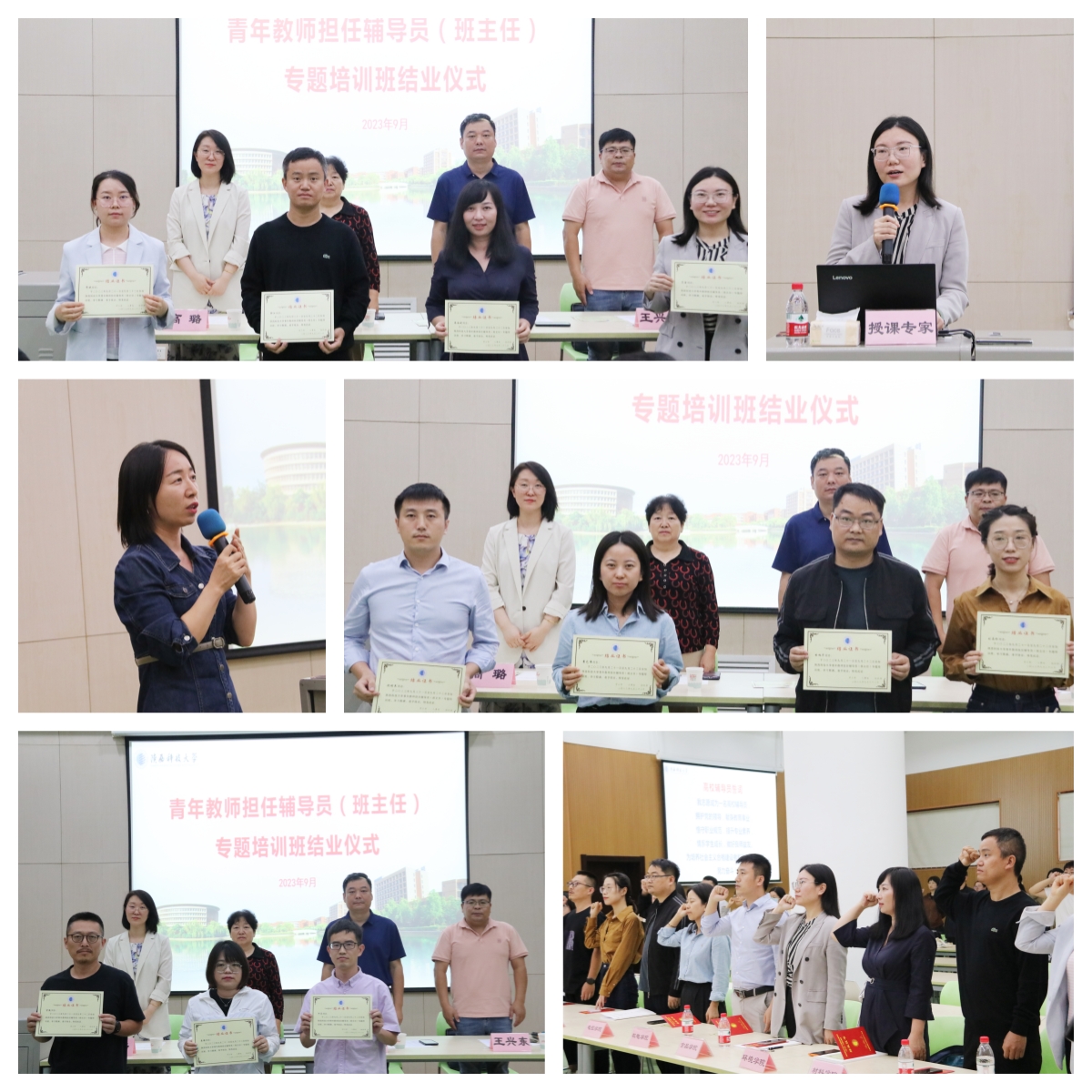 结业仪式上,食品学院范鑫、化工学院陶秀娟作为学员代表发言,分享了参与本次培训的心得体会,学工部、人事处、组织部等部门负责人为学员代表颁发结业证书。全体学员进行了高校辅导员誓词宣誓。