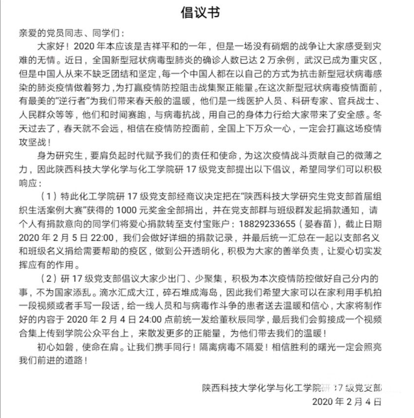 bet36365路检测中心马克思主义学院研18党支部、化工学院研17党支部、设艺学院研17党支部自发捐款,为抗击疫情贡献绵薄之力!