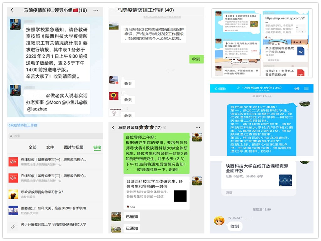 学院坚持“三个到位”工作标准,即学校要求通知到位、防控知识科普到位、思想认识统一到位,抓好疫情防控宣传教育。通过微信、QQ等方式及时传达学校关于疫情防控工作的各项安排和要求,发布或转发《坚定信心克时艰,众志成城战疫情——致马克思主义学院全体师生的一封信》《请查收!陕科大防控疫情的近期通知汇总》等通知公告,分享来自权威机构和官方媒体发布的预防知识,教育引导师生理性对待疫情、遵守学校规定、做好科学防护,切实把思想和行动统一到习近平总书记对疫情防控工作的重要讲话和指示批示精神上来,统一到学校关于疫情防控的决策部署上来。