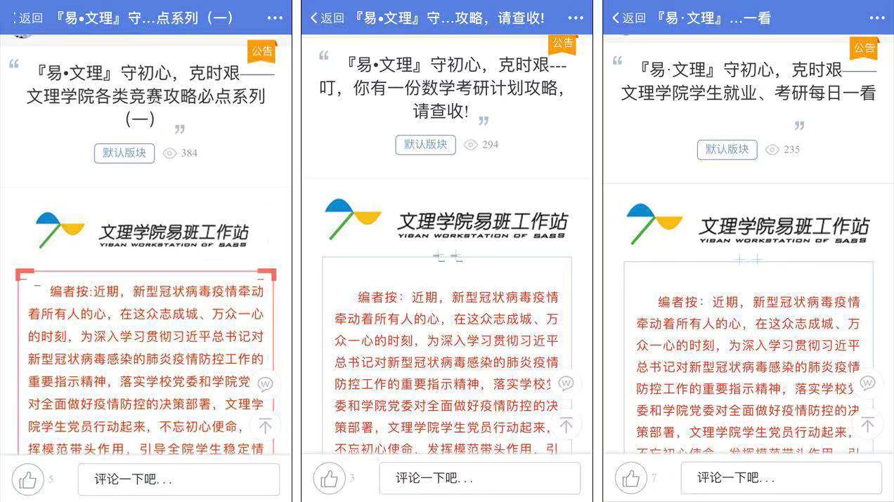 在政策宣传方面,教育学院党务工作中心带领全体党员积极筹划、群策群力,对学院学生党建官微后台进行改版,新增了疫情动态(实时状况、疫情解疑、直击现场)、辟谣科普(辟谣科普、个人防护)及驰援武汉(我为武汉加油)栏目,宣传党的政策方针。在学业帮扶方面,成立了教育学院学业帮扶党员工作小组,学生党员对全院学生挂科情况进行了摸排,并对接班委对学生学习状况进行分析,以难点科目以及挂科数目多的学生为重点,制定详实可行的辅导计划,共享学习资料并及时进行线上答疑,在学业上进行精准帮扶。