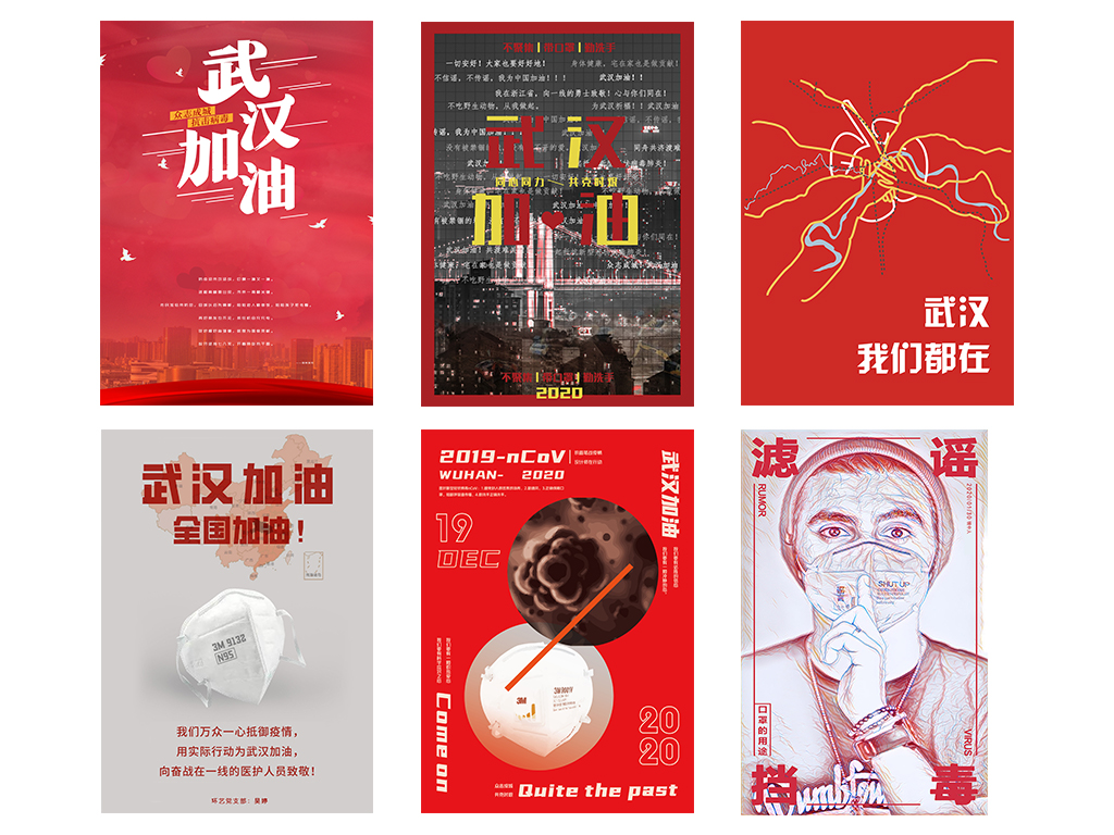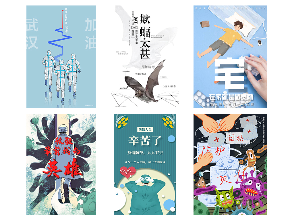 设艺学院9个本科生党支部充分发挥设计专业特长共制作了91张“新型冠状病毒感染肺炎疫情防控”主题海报设计作品,设计主题包含:防疫知识宣传、致敬英雄和加油鼓劲类,密切关注疫情防控工作的点点滴滴,服务师生等。