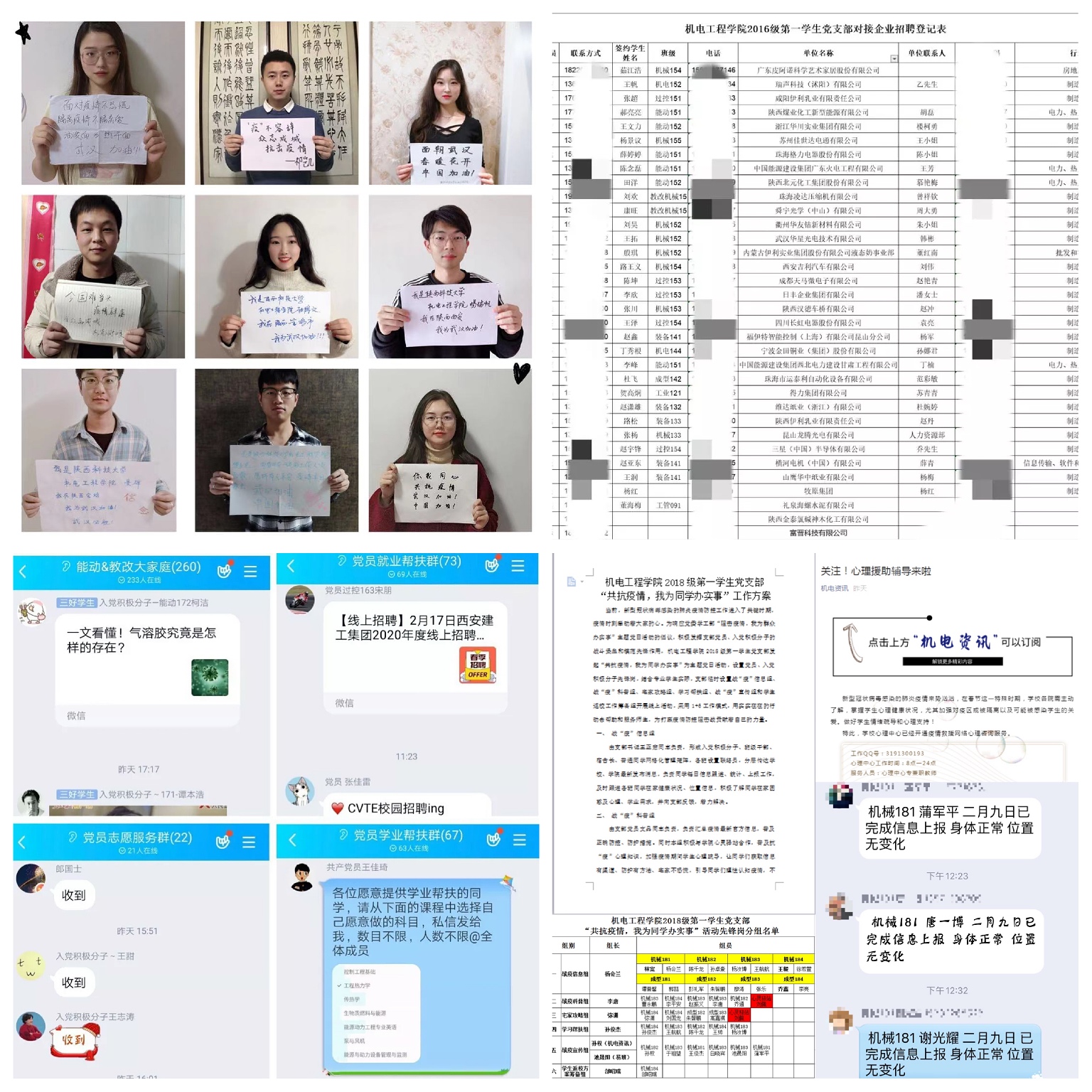 2016级三个学生党支部根据毕业班学生就业、考研的实际情况,开展分类指导,精准帮扶。2016级第一、二学生党支部积极开展就业、考研、学业帮扶工作,持续开展“一联一帮”活动,即联系企业和帮助就业困难学生。2016级第三学生党支部动员全体党员和积极分子,成立疫情信息统计与防治、就业考研服务、资源分享三类专题小组,指导学生科学防治疫情,对考研及就业学生精准施策。