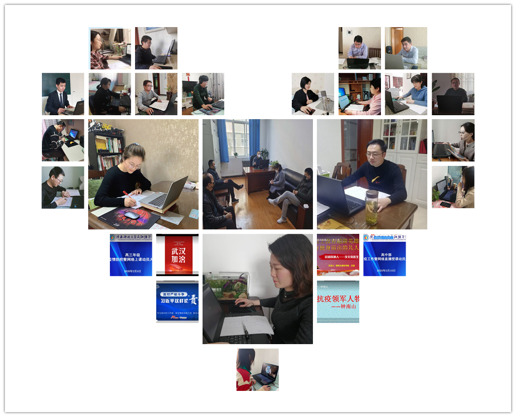 高中教师马轩从生物学科视角通过直播义务向附中师生宣传新型冠状病毒肺炎的病理及防控方法;物理教师向武军热心周到、耐心细致地帮助老师们解决直播授课过程中遇到的问题;数学教师韩伯阳父亲身患重病一直在住院治疗,但仍然保质保量完成疫情防控和线上教学工作;地理教师赵立平除了每天备课、上课外,还负责了两个班学生的数据统计,工作量翻了一番;高三教师刘梅因病本该好好休息,但因心怀学生仍坚持上课;还有很多老师争相承担德育授课任务,认真准备,积极为特殊时期上好思政课,打牢学生成长成才的思想基础贡献力量。