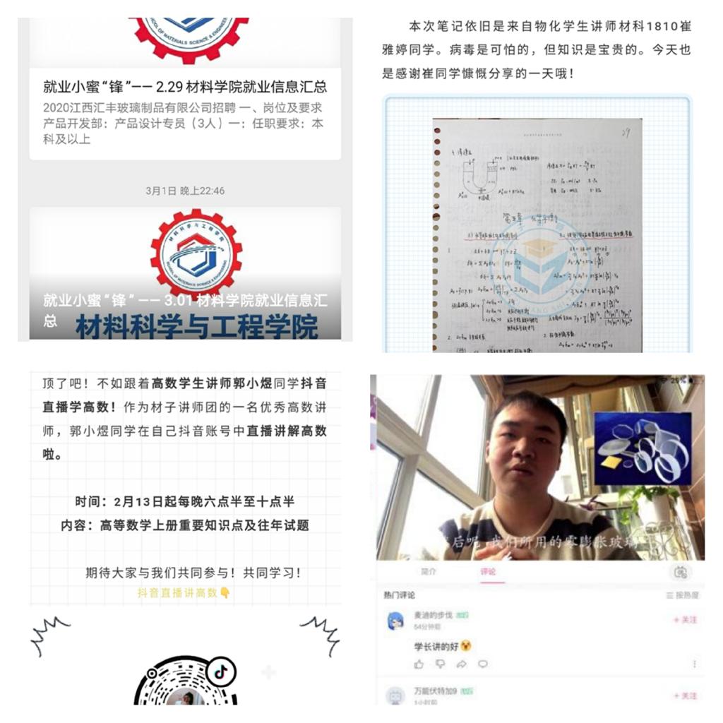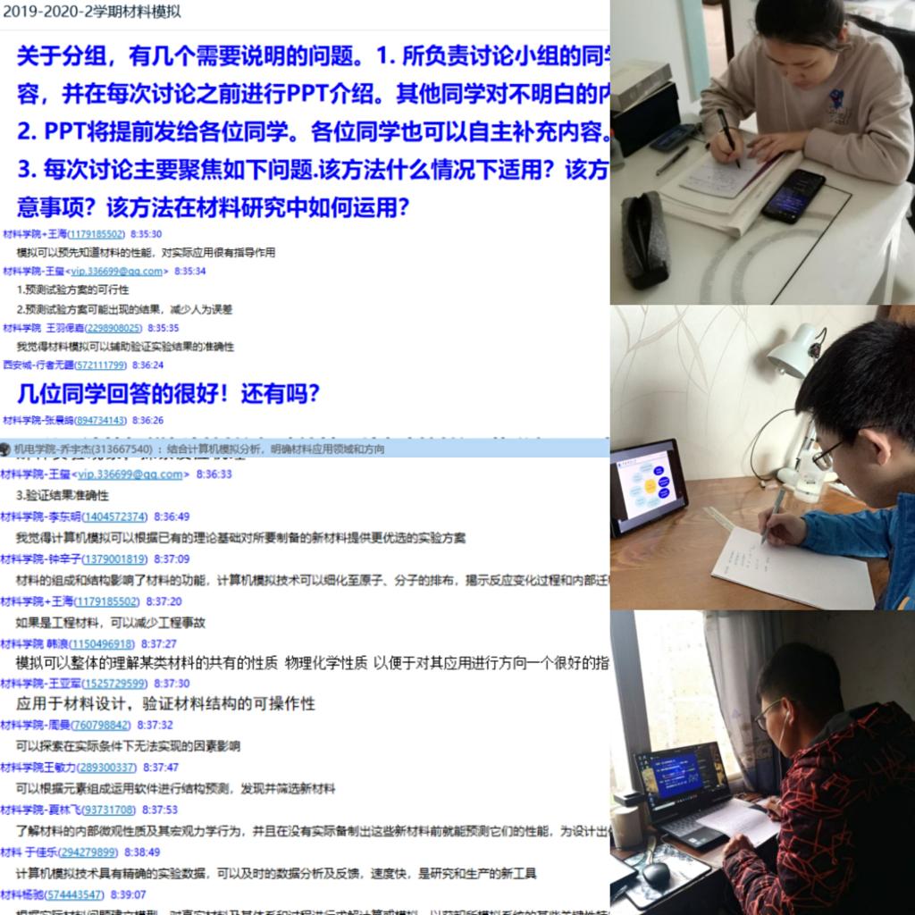 为了如期开课,提高线上授课质量,材料学院有效开展线上教学主阵地建设,充分准备、提前调试,积极完成课程线上教学预案,组织教师线上培训70余人次。开课第一天,学院通过超星学习通、在线雨课堂、中国大学MOOC等平台开课22门,涉及上课教师41人、上课学生近1000人次,到课率达99.8%,在线课堂签到、讲解、互动、讨论、答疑等环节有序运行。另外,学院还针对毕业生就业、毕业论文撰写、补考等具体工作,安排教师开展线上“一对一”指导;成立“党员就业小分队”,近22日来连续搜集整理线上招聘、复试调剂、公考等资讯向广大毕业生发布;“材子讲师团”依托抖音、直播、笔记分享等方式开展线上学习和补考帮扶31人次。线上线下有序衔接,确保复学复教各项工作主动出击,有所作为。
