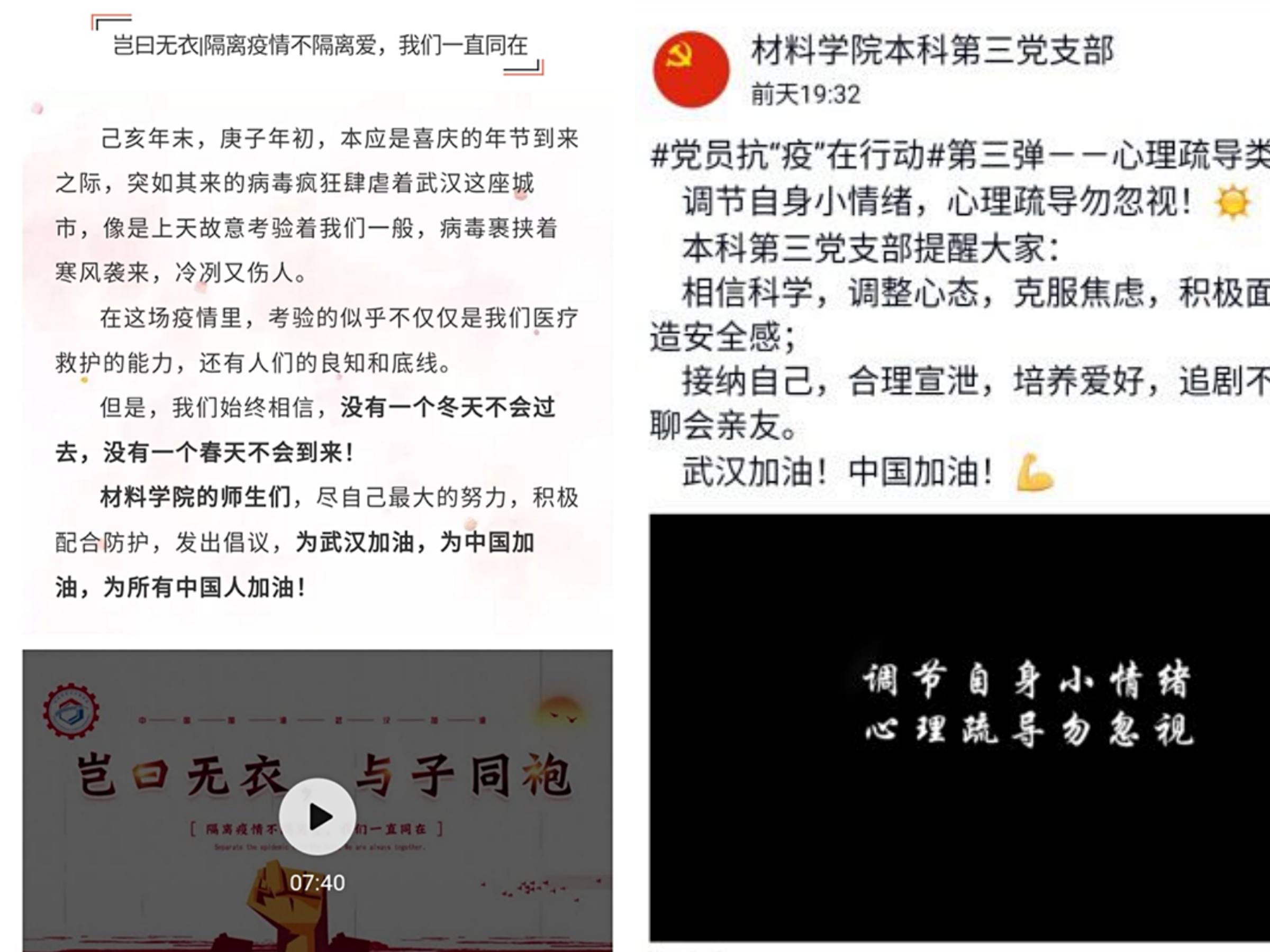疫情发生以来,材料学院广泛号召全体师生参与其中,冷静客观认识疫情。截止目前,学院根据疫情发展发布《材料科学与工程学院关于做好新型冠状病毒感染的肺炎疫情防控工作方案》3次,发布疫情工作通报3次,发布师生及校友倡议2次,各党支部、学生组织通过视频、推文等发布科普知识、心理疏导、家庭教育、日常防护等内容,研究生导师开展线上 “一对一”心理疏导工作,全方位全员开展健康教育引导。另外,学院还有6位老师参与门卫值守、快递分发、蔬菜运送等志愿服务工作、15位老师参与居家隔离 “一对一”联络帮扶工作、6名同学参加所在社区(村)疫情防控工作,用实际行动激发全员抗疫的信心。