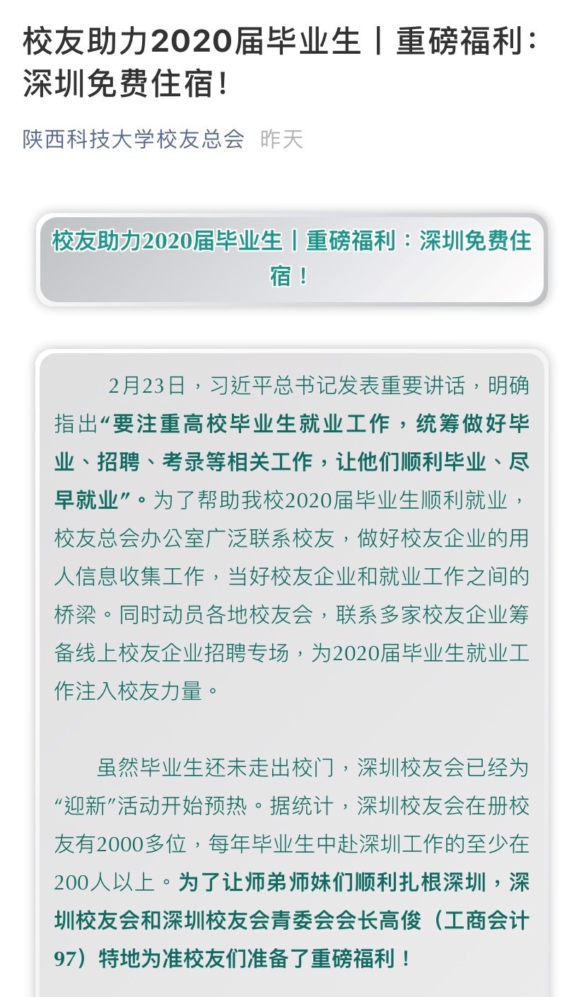 为帮助2020届毕业生扎根深圳、顺利度过从学生到社会人士的过渡期,日前,36365官网会计97级校友高俊(深圳校友会青委会会长)通过校友总会办公室、深圳校友会向母校2020届毕业生发出公告,即日起将为赴深工作的师弟师妹们提供5天免费住宿。公告刚一发出,就得到了母校师生和社会的广泛赞誉。