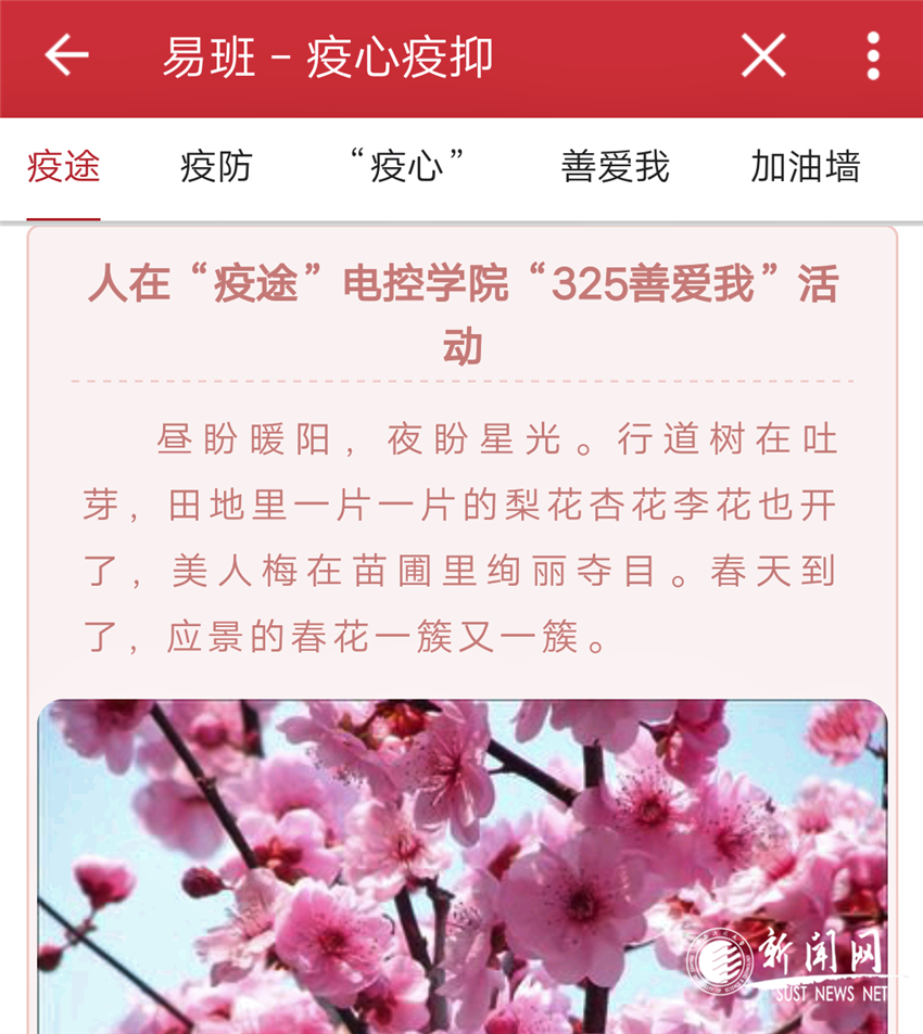 3月25日,活动伊始,电控学院心理协会在易班搭建心理云倾诉平台,人在“疫途”活动为学生提供心灵陪伴“树洞”,作为心理育人宣传季启动仪式,号召学生分享居家隔离期间学习、生活心得、收获与感悟,以学生喜闻乐见的方式,搭建沟通桥梁,在增进相互理解交流的同时,发挥青年学生健康向上、积极乐观的先进导向。