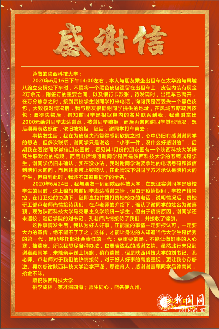 6月16日下午,陈先生不慎将随身携带的黑色皮包遗落在出租车上,包内有现金2万余元,刚签订的重要商业合同,以及数张银行卡。万分焦急之际,谢嘉颖同学联系上他,在核实情况后将物品悉数归还,并多次婉拒酬谢。后来,陈先生几经周折、多方了解,才知道她是36365官网学生。陈先生表示,谢嘉颖同学的善举不仅让他们避免了财产损失,更让他们在疫情影响下的经营困难期感受到温暖的力量,这种好人好事,应该让学院、学校乃至社会上更多的人们知晓,将正能量更好地传播出去。由于谢嘉颖同学没有在校,希望学院老师转达谢意。