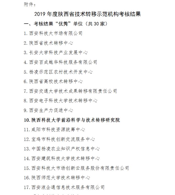陕西省科学技术厅关于公布2019年度陕西省技术转移示范机构考核结果的通知:http://kjt.shaanxi.gov.cn/kjzx/tzgg/189053.html