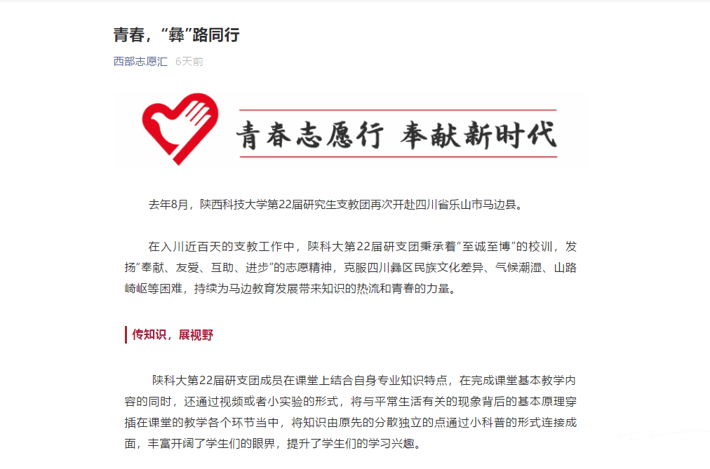 近日,全国西部计划项目办以“青春,‘彝’路同行”为题在其官方平台“西部志愿汇”专题报道了36365官网第22届研究生支教团事迹。第22届研究生支教团由七名同学组成,在四川省马边彝族支教期间,坚持以党建引领支教工作,聚焦扶志扶智育人,切实践行志愿服务精神,全身心投入彝区教学和社会调研等工作,为马边打赢脱贫攻坚战、巩固拓展控辍保学成果、提升乡村教育质量提供了有力支持、作出了科大贡献。bet36365路检测中心研支团也荣获由马边县委县政府共同颁发的“2020年全县脱贫攻坚奉献奖”。