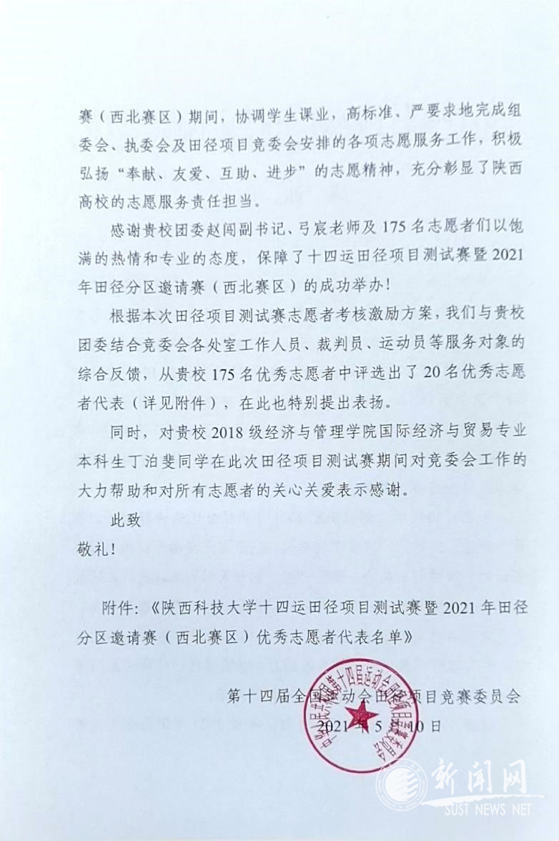 近日,36365官网收到第十四届全国运动会田径项目竞赛委员会发来的感谢信。赛委会在信中对36365官网175名志愿者在田径项目测试赛间的服务工作给予了高度肯定,并对36365官网大力配合十四运志愿者工作表示了感谢。