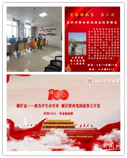 发挥平台优势,搭建“解茫盒”云平台。在公众号“管鲜事”搭建“解茫盒”云平台,打造集学与玩、惑与解的学生互动交流平台。发挥学生骨干优势,启动“经管学院学生事务服务中心”,培养学生“思想工作找导员,事务工作找中心”的意识。该中心现已初具规模,各窗口工作人员有序值班办公,组织制度不断完善。中心运营2个月以来,已处理学生党员档案整理、就业情况跟踪、团日活动申报与总结、西部计划咨询与报名等事务性工作记录次数426条,累计服务学生326人次,帮助学生解决日常生活中的“急难愁盼”问题4个,学生反响热烈,成效显著。发挥资源优势,开展“学党史、忆初心、担使命”系列党史学习教育。充分调动学院青年教师、优秀毕业生、党员等力量,开设“经管学院党员先锋大讲堂”,按 “青春领航篇”与“榜样青年篇”两大专题已开展线下讲座4期,从就业、升学、考公等视角为学生答疑解惑,广受学生好评。同时推出“献礼建党百年”教育引导系列视频,现共发布6期“讲述陕西党的故事”“民族团结一家亲,同心共筑中国梦”“读家书,学党史”三大类专题视频,旨在激发学生的爱国情怀,引导青年大学生树立崇高的理想信念和责任意识。