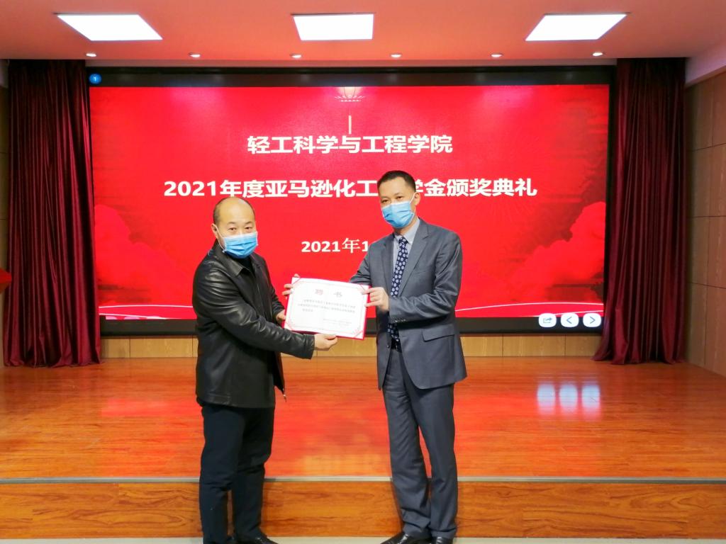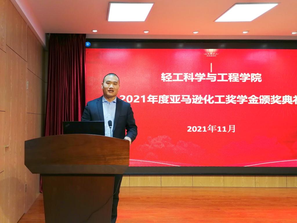 11月26日,“亚马逊化工”企业奖学金颁奖典礼暨企业导师聘任仪式在轻工科学与工程学院一楼学术报告厅举行。亚马逊化工有限公司技术总监卢焌鏢、区域经理王兴飞、客户经理张彬,轻工学院副院长张辉、党委副书记张乾隆、造纸工程系主任罗清、造纸工程系教授韩卿及学生代表参加仪式。