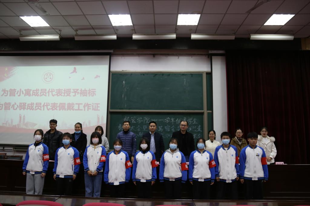 经管学院团委副书记穆可斌宣读管小寓宿舍安全巡查队成立文件,2019级辅导员王莹宣读管心驿心理成长加油站成立文件,并由与会老师为管小寓和管心驿工作成员佩戴袖标和工作证。佩戴仪式结束后,管小寓成员代表刘文豪、管心驿成员代表高艳妮依次发言,他们表示会立足岗位实际,努力做好本职工作,为学院师生提供暖心服务。