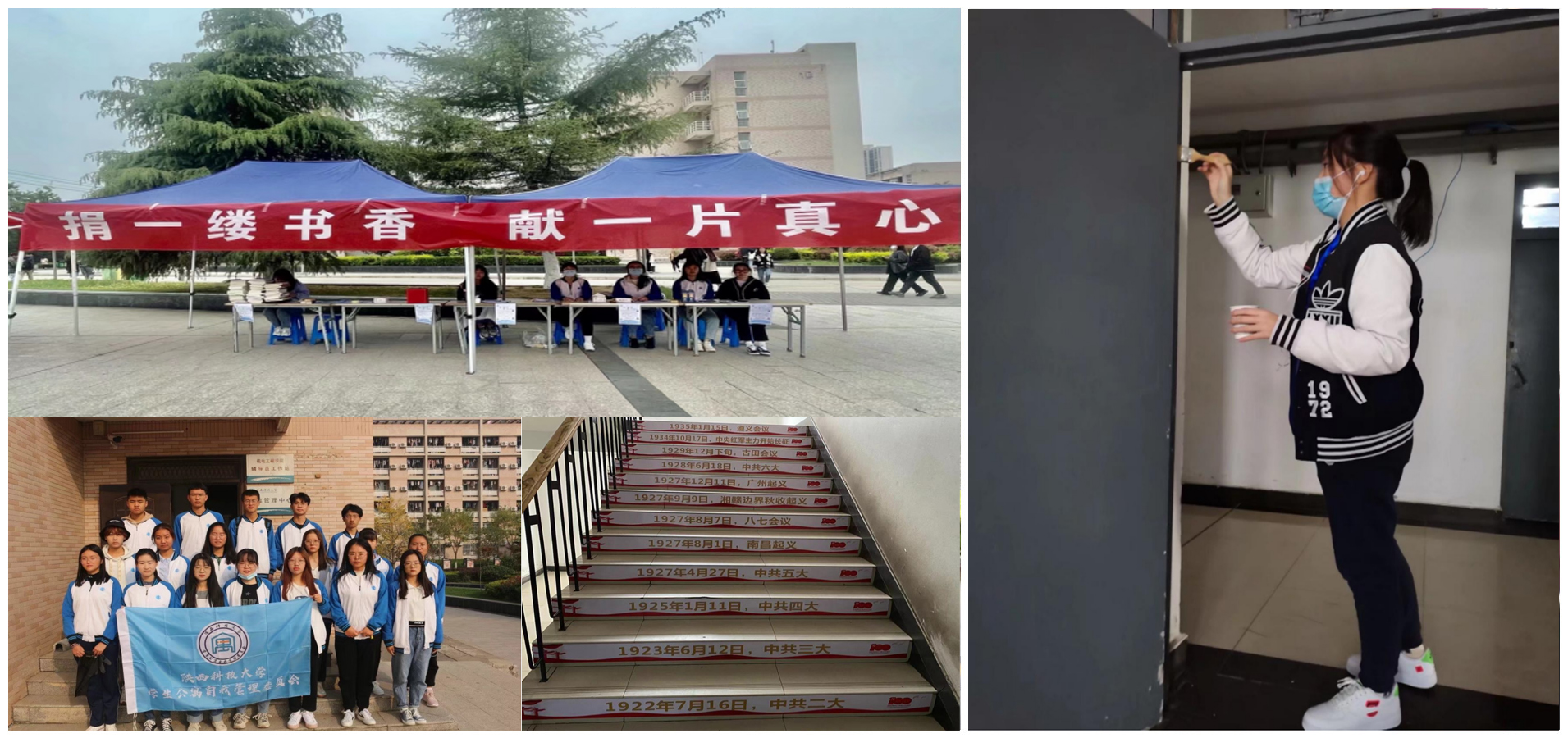 工作开展依靠学生。依托学生公寓自我管理委员会,促进学生健康文明行为养成,丰富公寓文化生活和创造良好生活环境。开展“小广告”集中清理行动,清除生活区行道树、电线杆、灯箱上的纸迹和胶带,美化校园环境;开展“捐一缕书香,献一片爱心”活动,鼓励同学们捐献闲置书籍,既避免浪费又让爱心流转;开展“党史学习进公寓”活动,装饰楼梯台阶和楼道墙壁,让学生们随时随地学习党史,感悟党的风雨历程;积极开展志愿服务活动,走进每间宿舍,给门锁滴加润滑油,方便同学生活,润滑的是门窗,滋润的是心灵。