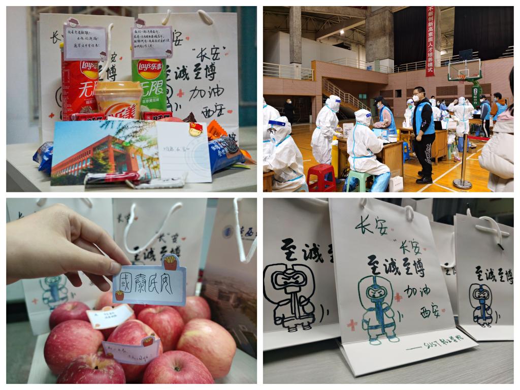 12月21日,师生核酸检测工作有序进行,医务人员的身影犹如一道美丽的风景线,在文体馆内的“战场”内伫立着。轻工学院疫情防控党员先锋队深受触动,立即决定组织学生党员为医护人员精心准备心意满满的小礼物——写满正能量话语的卡片、象征“平安”寓意的苹果、代表着“奥利给”的饼干、谐音“视”事顺心的眼贴等;还自发创作爱心手提袋,通过手绘简笔画使每一份礼物都与众不同,希望用特别的“暖心”汇聚战“疫”力量。
