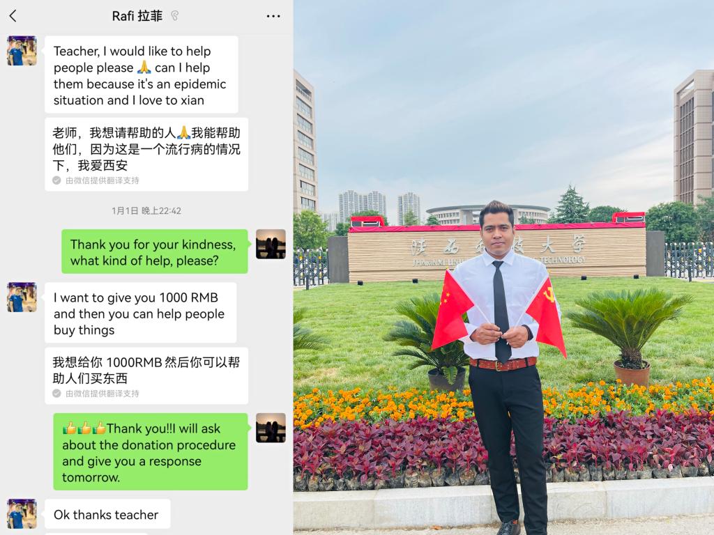 拉菲是36365官网轻工技术经济与管理专业的国际博士生,自2018年起在36365官网学习,平时表现优秀,积极参加学校组织的各类活动,今年获得工商管理硕士学位后,选择继续深造攻读博士,目前正在浙江温州进行专业实践。自陕西新冠肺炎疫情发生以来,拉菲一直心系母校,每天都关注着西安的疫情形势和在校师生的情况。这天,他主动与辅导员联系说:“bet36365路检测中心就像我的家一样,我希望能尽自己的绵薄之力,帮助我的家人们度过难关。”