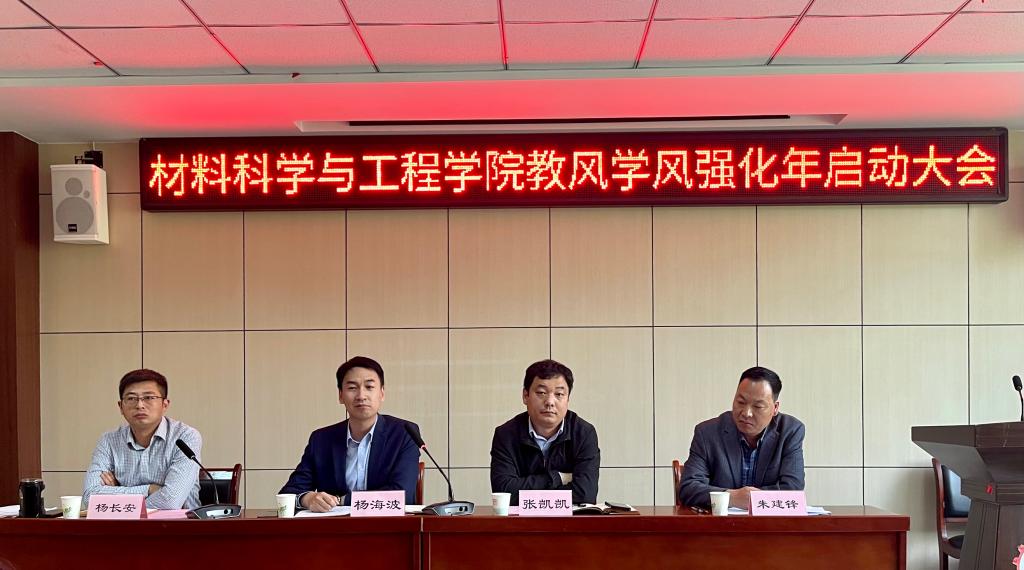 为进一步优化育人环境,完善教风学风工作机制,助力人才培养高质量发展,落实立德树人根本任务,4月21日下午,材料科学与工程学院组织召开教风学风强化年启动大会,教务处处长杨海波、学工部部长张凯凯、学院班子成员、各系室主任(副主任)、教工党支部书记、辅导员、教师代表和学生代表参会。学院党委书记杨长安主持会议。