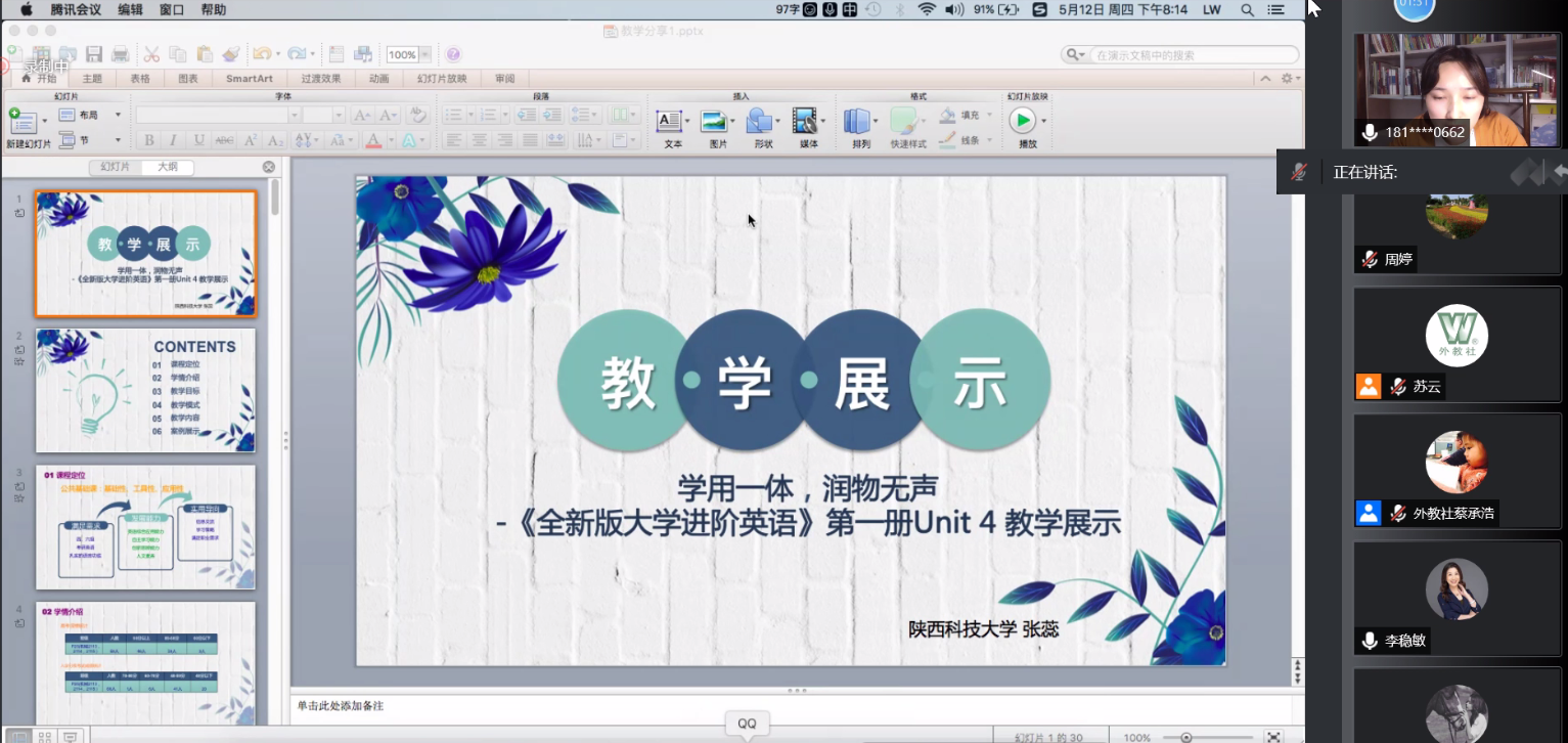 随后,张蕊、黄佳乐分别以“学用一体,润物无声”和“应用为基,育人为本”为题进行了教学展示,分享了针对普通班和提高班不同的教学方法和教学感受。张蕊老师以“驱动型产出任务+促成性教学活动+混合式教学评价”的模式,充分利用各种课程资源,达成课程的知识、能力和素质目标,利用“思政课程包”实现课程思政的“润物无声”。黄佳乐老师根据提高班的具体学情,因材施教,充分利用慕课及信息化工具进行完整、立体、闭环的教学活动,开展丰富的小组活动,在小组活动中培养学生的自学能力、交际能力、合作能力和竞争意识。黄老师非常重视课程评价的数据化和可视化,运用过程化评估的详实数据让学生明确自己的优势和不足,从而实现教学评价对教学的反拨作用。两位老师精彩的课程展示赢得了在线教师和外教社的一致称赞。