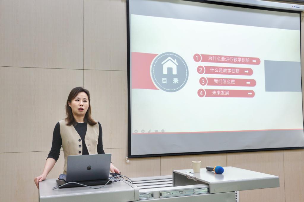 卓莉以《基于“以学生发展为中心”理念的教学创新方法与实践》为题做了经验分享,她主要从“为什么要进行教学创新”“什么是教学创新”“教学创新怎么做”“未来发展计划”四个方面分享了课堂教学创新的实践经验和体会。她细致梳理并解读了教育教学改革的相关政策及文件,剖析了传统教育面临的挑战以及信息化教学手段模式对教学所提供的帮助,阐述了以学生为中心的课堂教学创新的重要性、紧迫性、挑战性。对于怎样实现课堂教学创新,卓莉老师以所带课程《公共政策学》为例,对标教学创新大赛评分标准,系统讲解了创新思路和创新方法,并着重分析了教学痛点问题。她认为教学创新没有统一的标准,是多样化的,她希望大家善用顶层创新指导实践,超越知识本位,转变观念,重塑自身;真正在教学创新中实现师生共学,双向激发,教学相长。