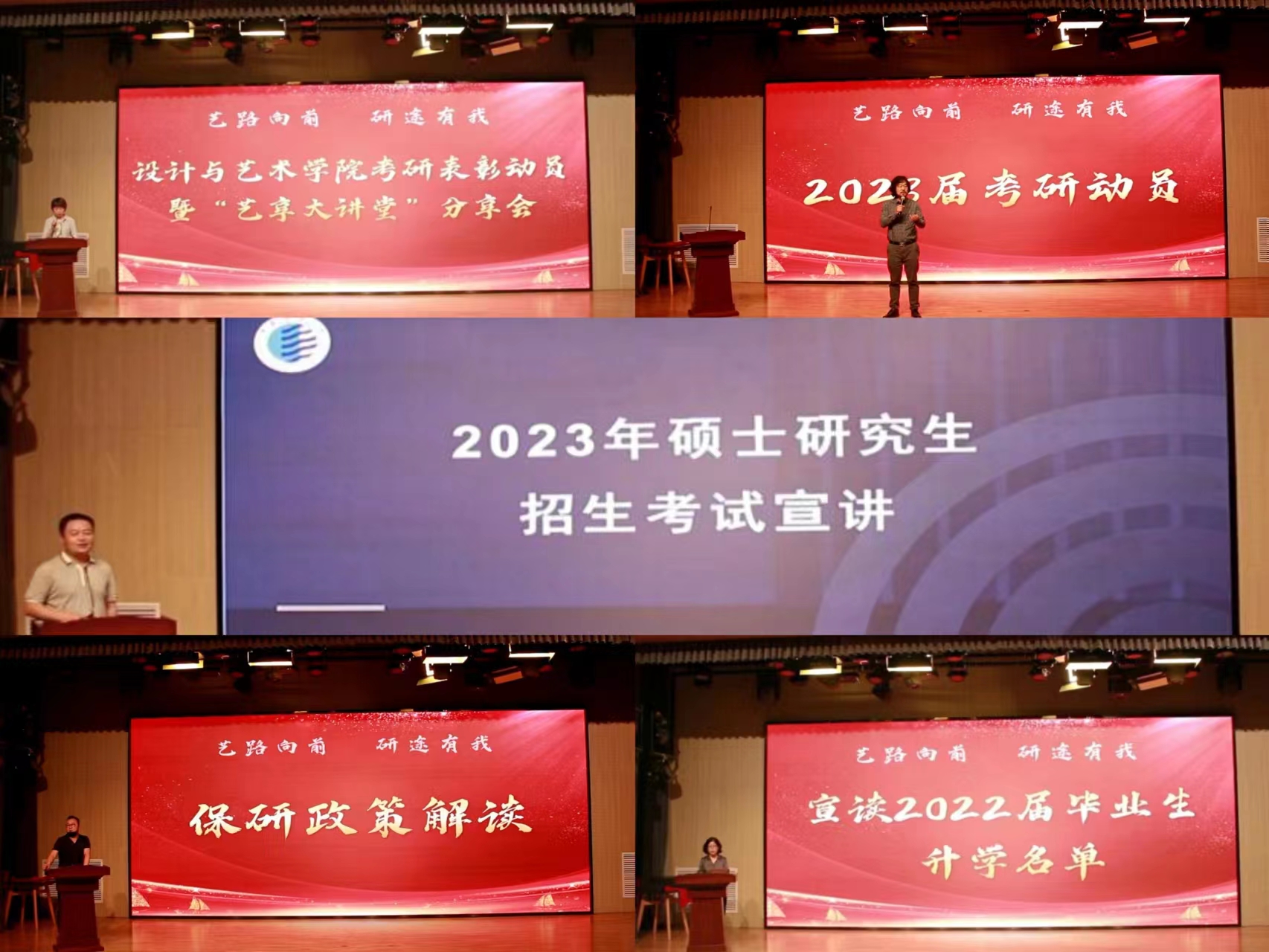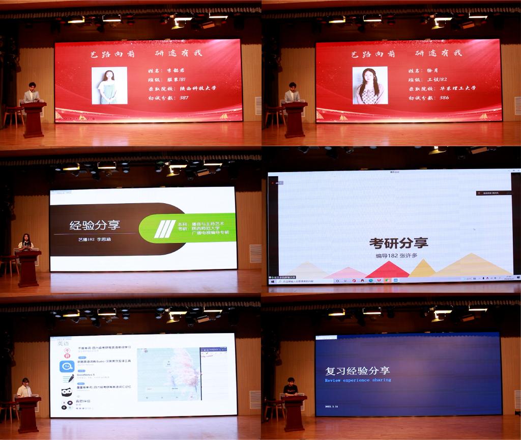“艺享大讲堂”分享会阶段,李韶君、徐月、董清华、魏一苇、沈思迪、张许多等7名同学作为优秀考研录取代表分别为大家做了考研经验分享。