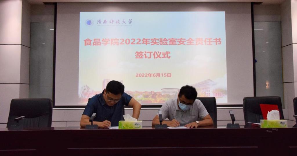 随后,学院举行了2022年度实验室安全责任书签订仪式,院长助理刘宁宣读《食品学院实验室安全责任书》具体内容。院长李国梁代表学院与相关研究室、本科教学实验室安全责任人代表签订了安全责任书。