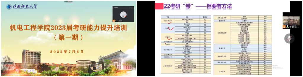 为进一步提升学风建设质量,深入落实学校本科人才培养“三三三”输出结构目标,提高人才输出质量,围绕2023届学生升学考研,7月6日,机电工程学院2023届考研暑期能力提升培训班正式开班。首期培训会邀请西部网、陕西新闻广播《教育直通车》节目特邀考研专家马回峰做专题讲座,培训会由2019级辅导员张伟刚主持,2023届考研学生参加会议。