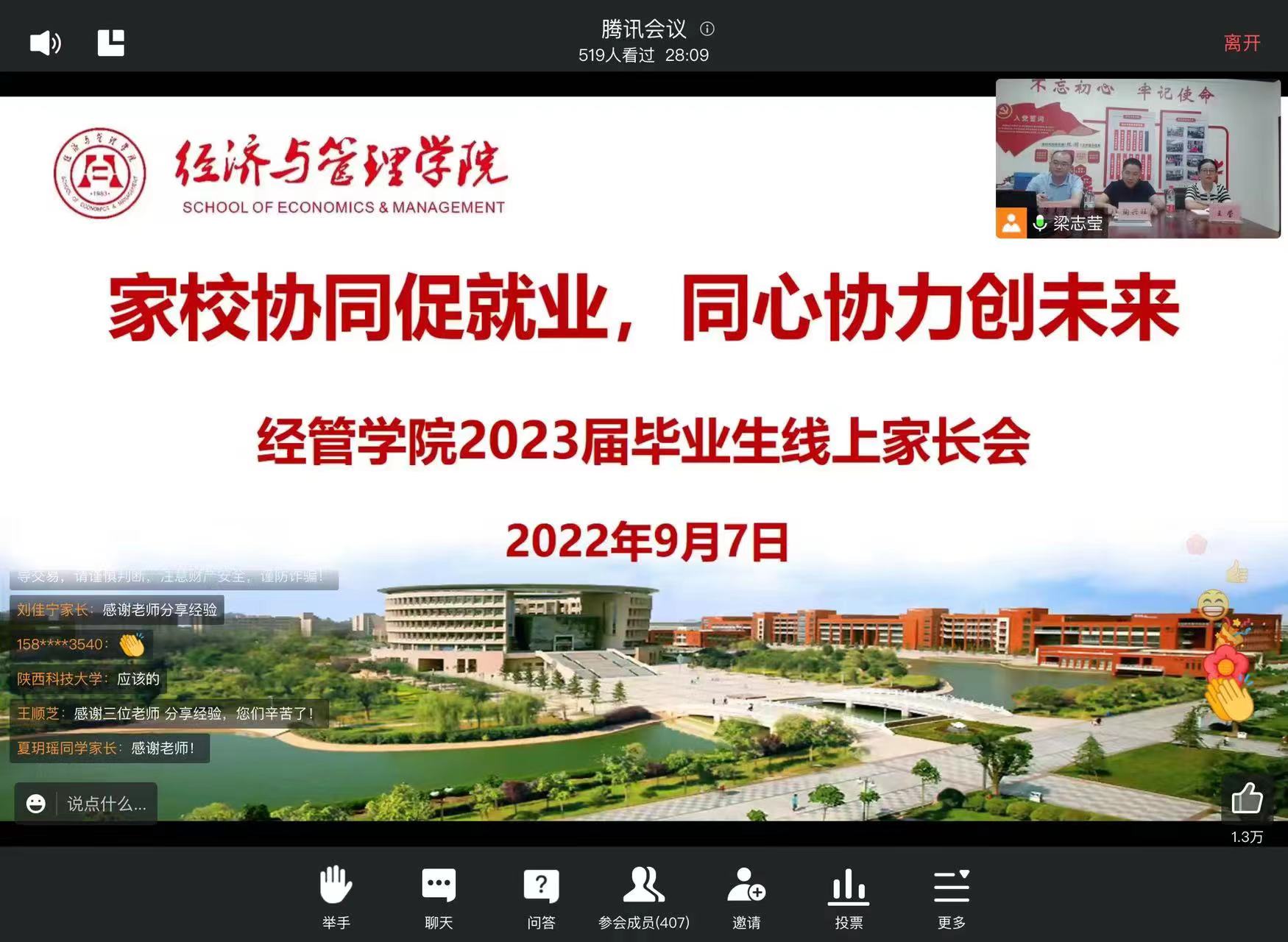 近年来,经管学院深入落实学校“三三三”人才培养目标,高度重视就业考研工作,始终注重家校协同育人,连续两年举办线上毕业班学生家长会。本次家长会的召开,一方面能够让广大家长和学生们更加清晰认清学院2023届毕业生所面临的就业考研形势;另一方面进一步凝聚了家校共识,形成家校育人合力。