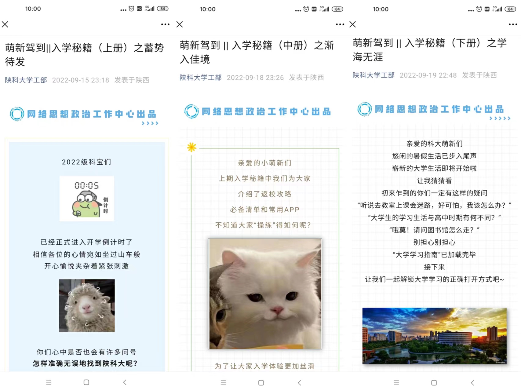 “在青春的赛道上奋力奔跑,争取跑出当代青年的最好成绩”,迎新返校期间,网络思想政治工作中心共在学生生活区内设置了数十条彩色横幅以及宣传展板,每位学生目之所至都能感受到学校的期待与祝福。同时,依托网络全媒体矩阵精心打造了“萌新驾到”系列专栏。先后推出《入学秘籍(上册)之蓄势待发》《入学秘籍(中册)之渐入佳境》等“影音图文”作品5篇,浏览量超过5万。专门开通了分阶段实施的新生入学教育易班优课群,包含校情概述、安全教育、心理知识、职业生涯规划等7个版块。新生在暑假期间按要求完成相应的课程学习,学习成绩经折算后计入入学教育考试总成绩,实现了线上学习和线下互动的有效贯通。