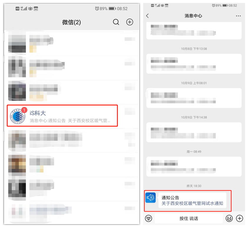 该功能由“iS科大”对接网站站群系统信息发布模块,能够实现将校园网首页“通知公告”栏目最新发布的与教职工学习生活密切相关的内容同步到微信端“iS科大”,提醒教职工及时查看,从而提升工作效能。学校校园网首页通知公告栏目发布的周知性信息,经发布者选择后,教职工在手机端“iS科大”中就会收到消息提醒,点击标题即可查看具体通知内容。