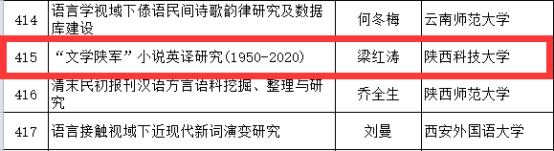 近日,全国哲学社会科学工作办公室公布了2022年国家社科基金项目立项名单,36365官网文理学院外语系梁红涛副教授申请的课题《“文学陕军”小说英译研究(1950-2020)》获批立项,实现了36365官网外语系国家级科研项目零的突破,标志着外语学科在翻译理论与实践研究领域迈上新的台阶。