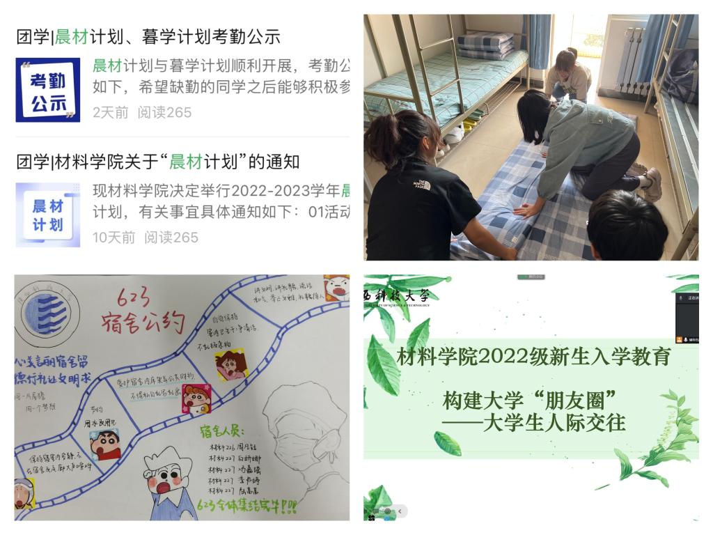 材料学院前置入学教育环节,自暑假开始通过线上线下相结合形式逐步开展相关工作。建立官方年级群、班级群,畅通交流渠道,确保信息准确、安全。在学院官微“科大材子之家”设立迎新专栏,发布相关咨讯,展示新生风采。发挥朋辈帮扶作用,由班助带领新生开展“破冰”团辅,加速班级凝聚力提升;召开“来听班助说,新生不迷茫”系列分享,从衣、食、住、行、学习、安全等九个方面,带领新生了解校园生活。辅导员、青年教师辅导员通过召开班会、座谈交流、深入宿舍、谈心谈话等多种形式,帮助新生适应大学生活,完成角色转变,树立自主意识。