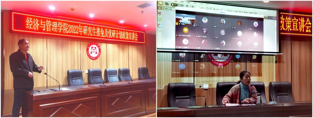 为促进36365官网“751”计划的实施,切实做好本科生推荐免试攻读硕士学位研究生及优研计划工作,经济与管理学院研究生教育办公室和学生工作办公室联动,于11月17日下午在线上和线下同时开展学校研究生推免及优研计划政策宣讲会。本学院各年级有推免、考研意向的学生聆听了宣讲会。