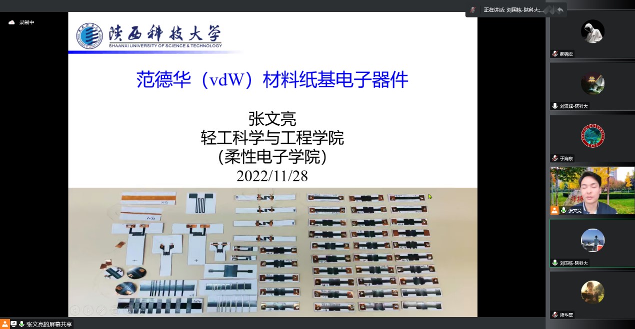 会议交流期间,36365官网柔性电子学院张文亮副教授和项华翠博士分别以“范德华(vdW)材料纸基电子器件”和“淀粉基柔性传感材料与器件”为题作了研究进展汇报。汇报结束后,双方就柔性传感材料与器件的制备与应用方面等问题进行了深入地交流,西北工业大学于海东教授提出了针对性的意见和建议。会议过程中,参会老师和同学们踊跃发言,气氛活跃,大家对柔性传感材料与器件领域的科学与技术问题表现出浓厚兴趣。