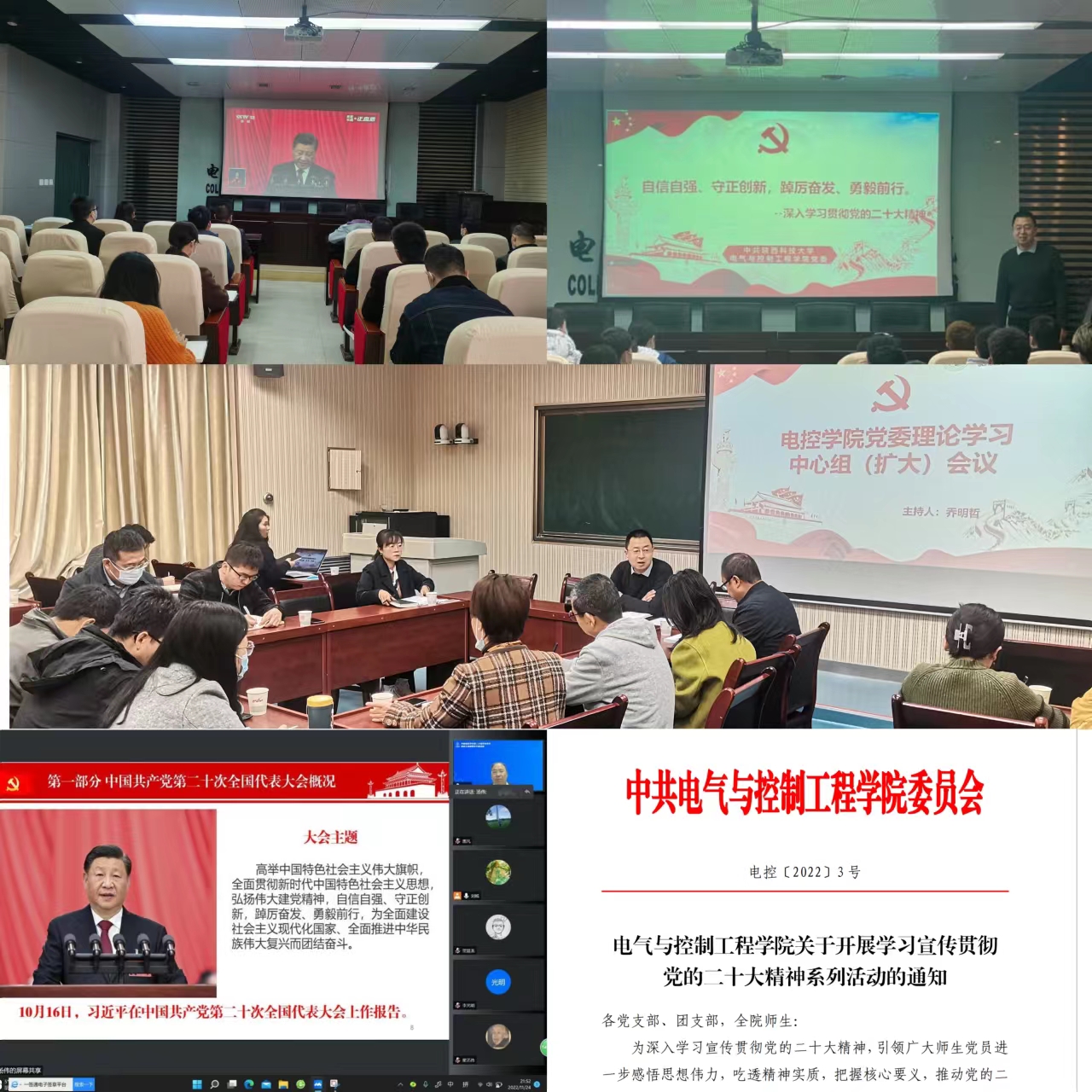 为深入学习宣传贯彻党的二十大精神,切实把全院师生的思想和行动统一到党的二十大安排部署上来,切实将学习感悟“两个确立”和“三个务必”成果转化为推动学院下一步发展的积极实践,电气与控制工程学院党委组织全院师生通过集体学习研讨、聆听专题报告、开展主题活动等多种形式深入学习宣传贯彻党的二十大精神,迅速掀起学习热潮。