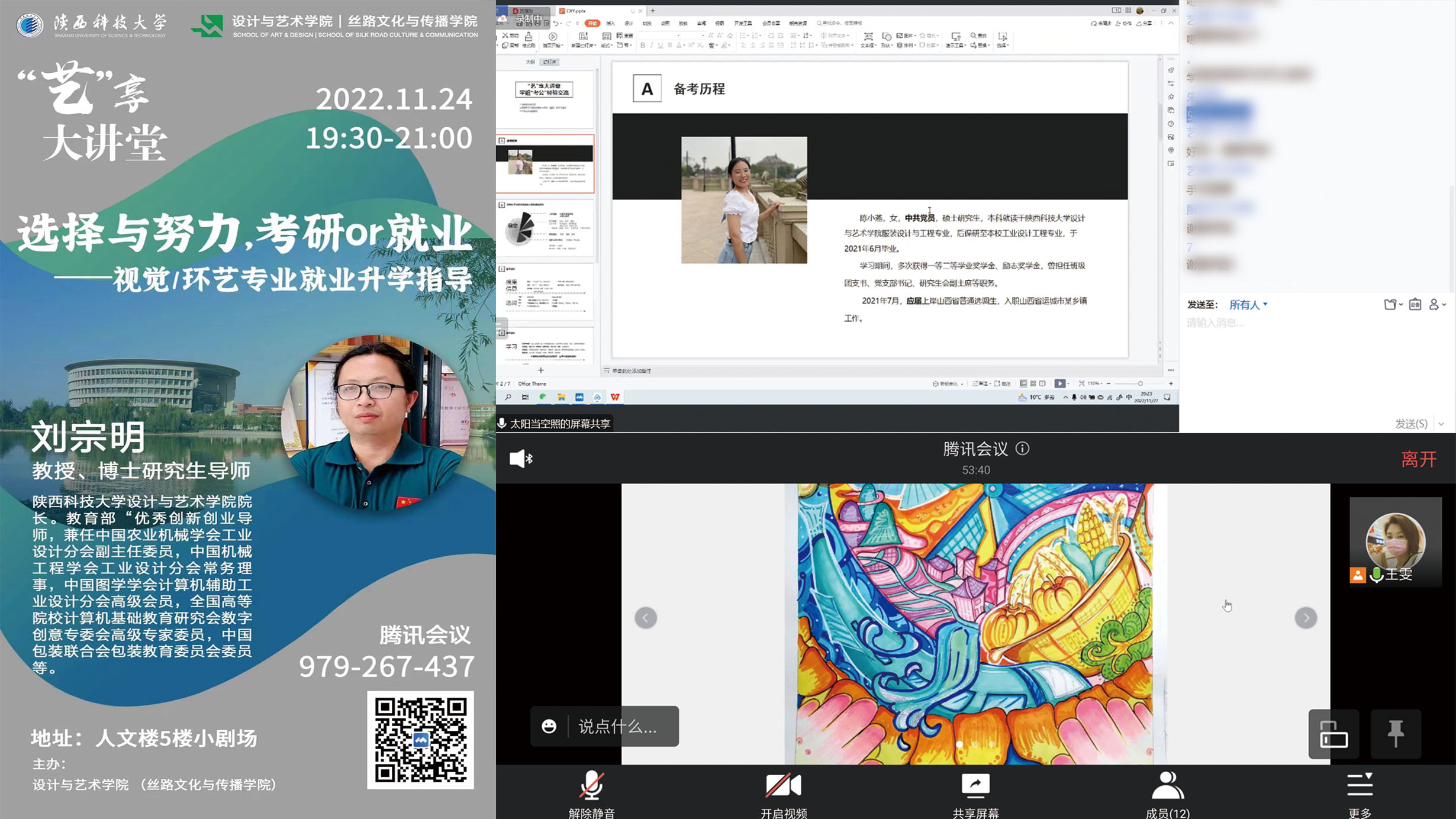 推进就业升学服务“保障线”。开设“艺享大讲堂”,帮助毕业生了解适应空中宣讲、在线笔试等新形式,引导学生客观理性认识就业形势,多角度激励学生科学规划发展方向。邀请学院院长刘宗明作“选择与努力,考研or就业”的专题讲座,帮助学生厘清发展方向,做好学业规划,科学精准定位;青年教师辅导员王雯雯举办手绘沙龙,发挥专业学习指导优势,与辅导员共同做好学生学业指导;邀请校友陈小燕、朱恺丽分享基层就业经验;邀请文都教育考研名师做“英语二作文”考前专场解析。承办“科大职讲堂”,邀请智联招聘金牌讲师讲授毕业求职面试与简历指导。