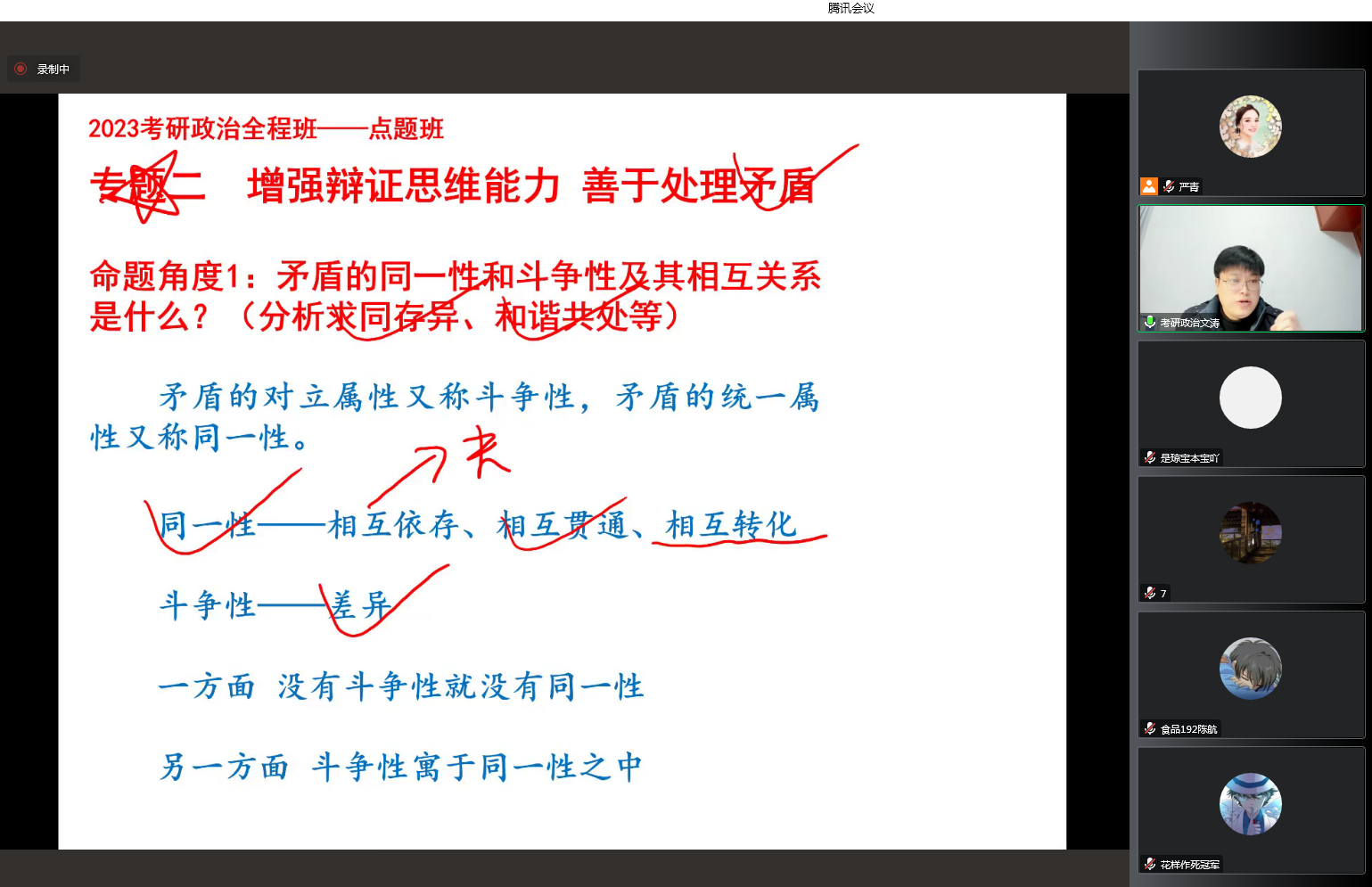 考研政治辅导名师文涛从政治科目涵盖的五门课程、题型结构和审题答题技巧三方面帮助同学们系统梳理重难点知识点和冲刺攻略,分二十四个专题对今年考研政治命题方向进行点题讲解和预测;运用生动形象的举例、深入浅出的逻辑推理、风趣幽默的讲课风格向学生们传授把大量知识点有机整合、关联记忆的技巧;列举常见的答题误区,示范审题答题技巧帮助同学们明确政治分析题的答题思路和方法。