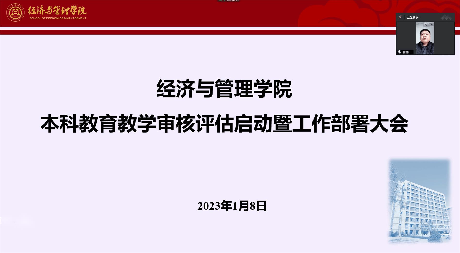 1月8日下午,经济与管理学院在线上召开本科教育教学审核评估工作动员会。学院党委书记崔楠、副院长薛俭、副书记陶兴旺、院长助理邢战雷、各教研室主任、实验室主任、校友联络员、各系资料员、教学秘书、相关辅导员等参与了本次会议。会议由崔楠主持。
