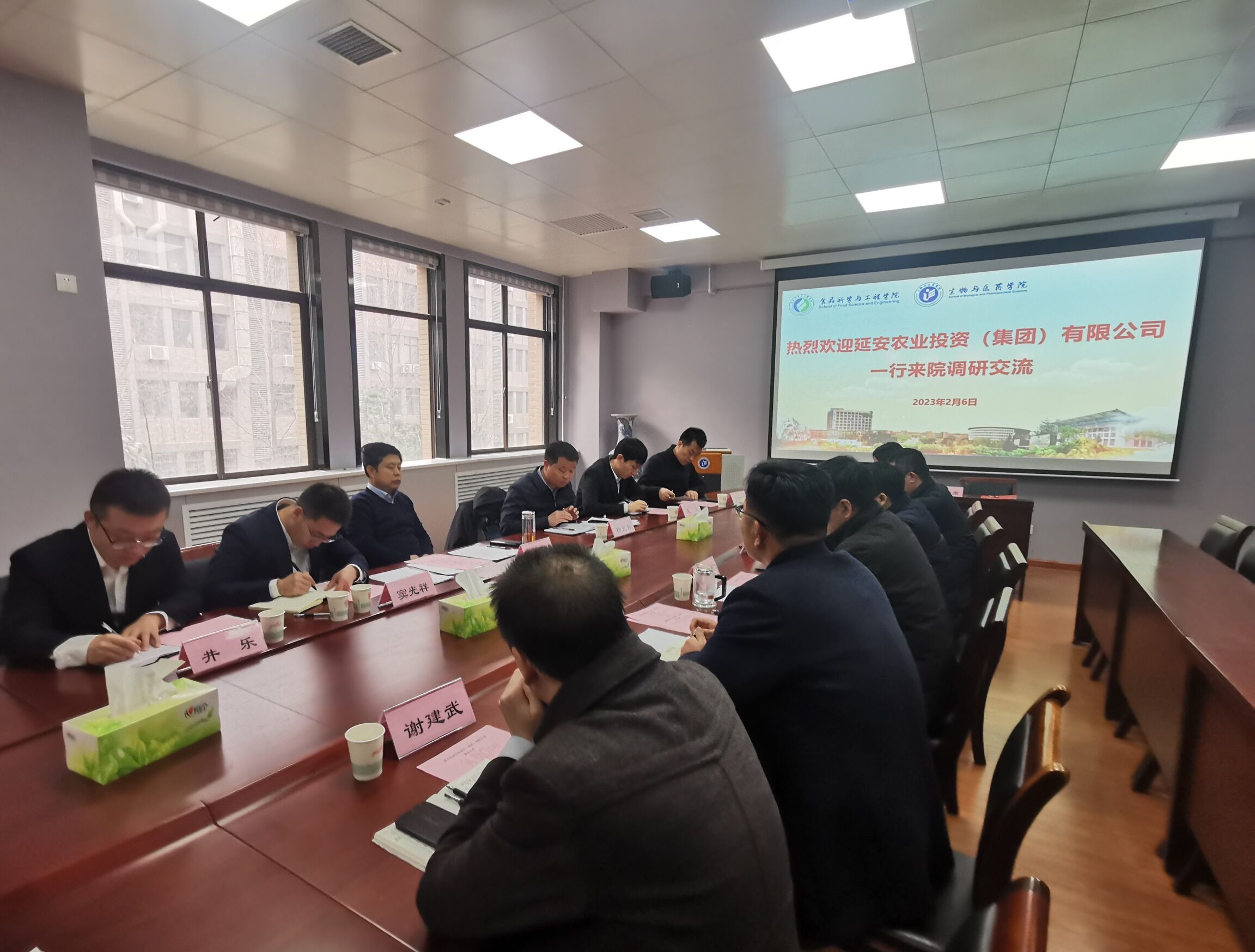 近日,延安农业投资建设(集团)有限公司(简称“延安农投”)党委书记、董事长杨东,总经理助理、生产技术部部长杨元智一行来校进行产学研合作签约交流。食品科学与工程学院党委书记訾荣禄、副院长(主持工作)李国梁以及相关研究方向教师参加了签约交流。会议由訾荣禄主持。
