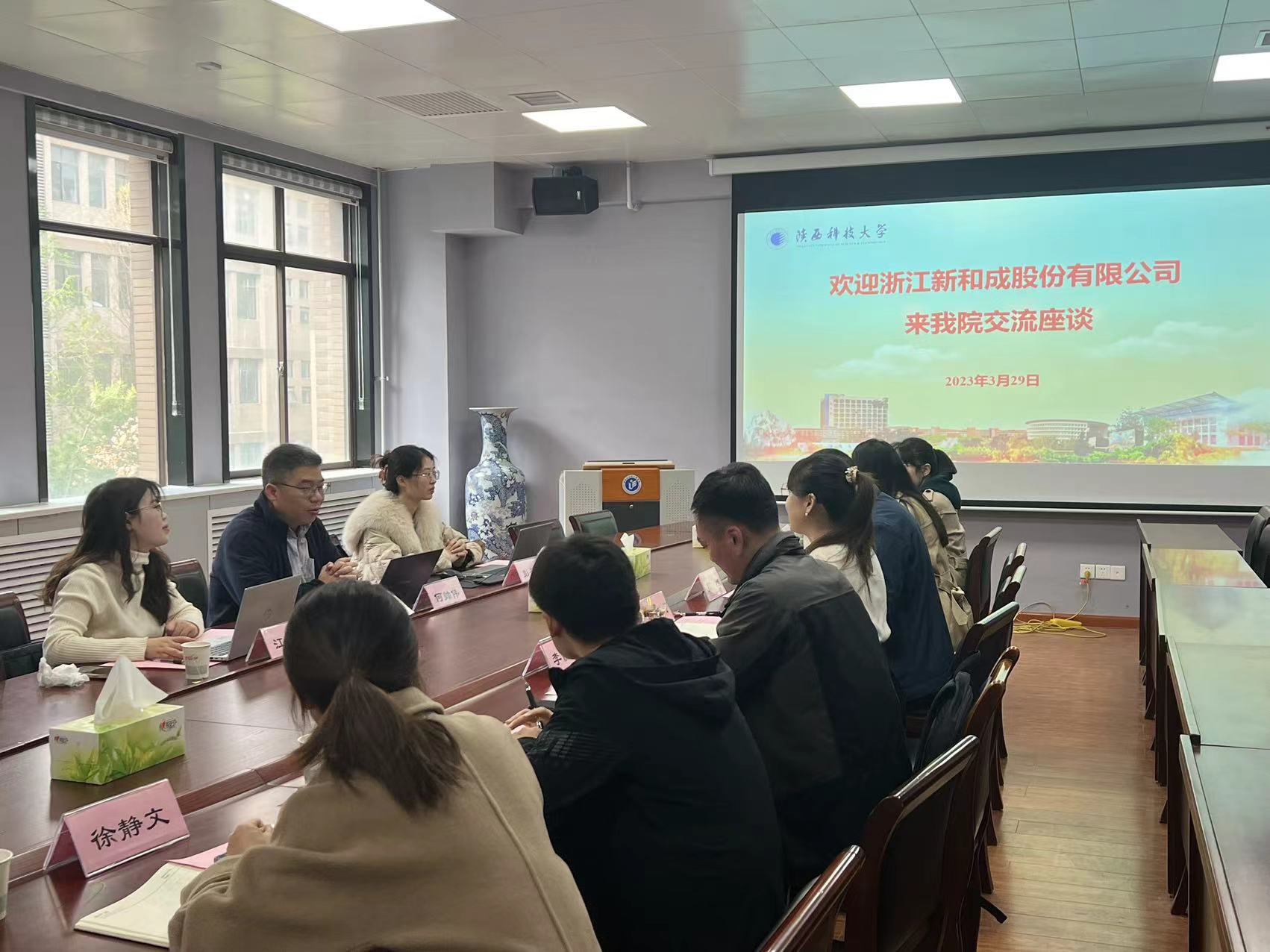 3月29日,浙江新和成股份有限公司董事会办公室副主任何帅伟,董事会办公室投资经理江梦娟、副经理彭丹柳一行到食品科学与工程学院(生物与医药学院)洽谈合作。食品学院党委副书记孙敏、院长助理高翔、相关教师代表参加座谈会。会议由孙敏主持。