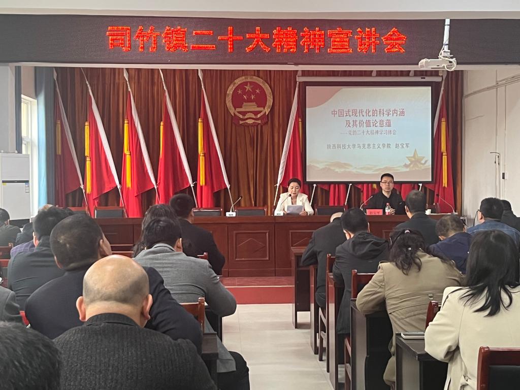 赵宝军为司竹镇全体党员宣讲党的二十大精神。司竹镇领导、全镇党员共80余人参加会议。宣讲过程中,赵宝军从中国式现代化命题的提出与发展历程、中国式现代化的科学内涵、中国式现代化的价值论意蕴三个方面,结合自己的学习思考,用生动的案例、真挚的情感、饱满的激情,对党的二十大精神作了全面宣讲和深入阐释。参会人员纷纷表示,要把思想和行动统一到党的二十大精神上来,将党的创新理论转化为新征程上团结奋斗、勇毅前行的实践力量。