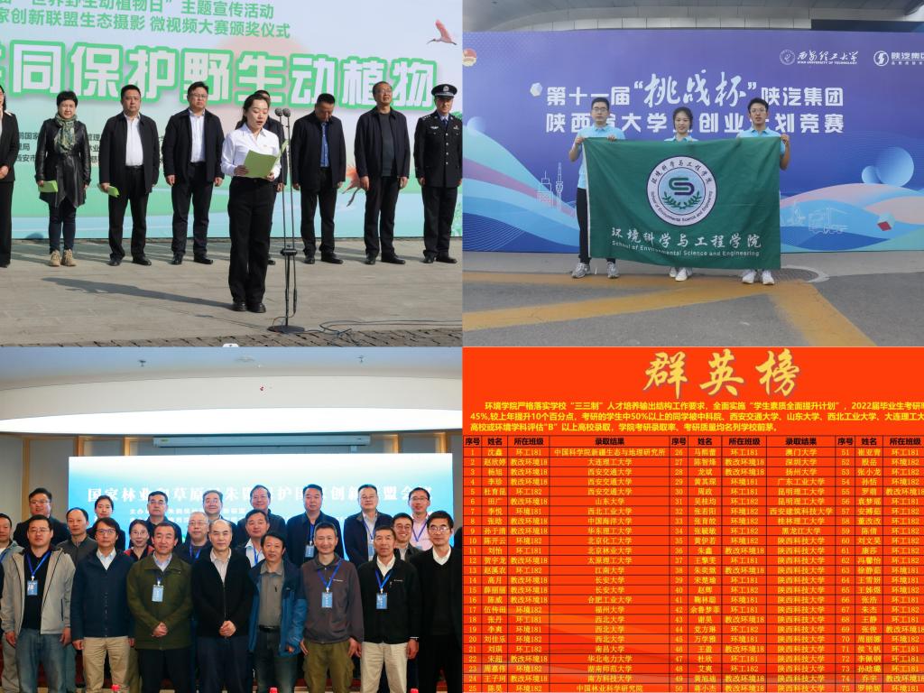 勇做环境保护的探索者。依托学科优势,围绕环境保护开展社会实践、科技创新等,先后荣获科创比赛国家级奖项8项、省级奖项20余项、校级奖50余项,获批省级环境保护类项目6项,连续五年荣获“秦岭生态科学考察项目”优秀项目,入选“朱鹮保护国家创新联盟”理事单位,“秦岭卫士”专业环保志愿服务品牌效应凸显,《关于加强秦岭珍稀濒危野生动物栖息地生态环境保护工作的建议》被全国政协采纳;教育引导广大学生牢固树立“科技报国”远大理想,献身国家生态文明建设,近三年学院考研率35.1%、45.5%、48.5%,大批优秀学子选择在环保相关专业继续深造,以更高更深的专业知识服务“绿色陕西”、建设“美丽中国”。