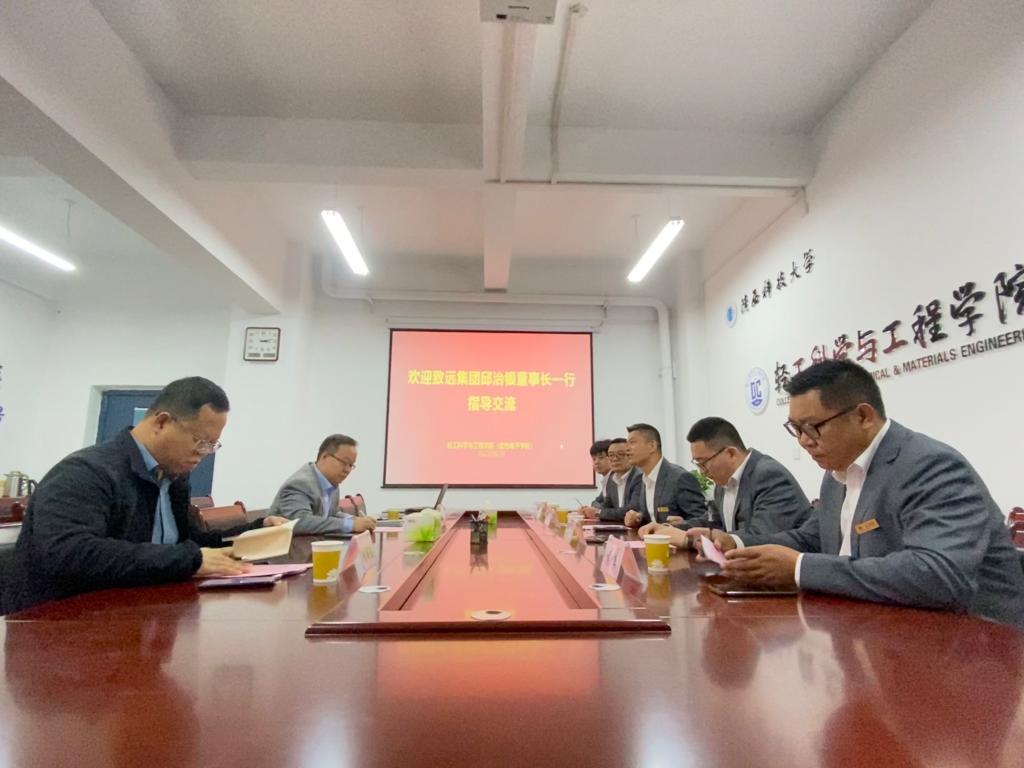 刘国栋对邱治银一行的到来表示热烈欢迎,同时也对轻工学院的学科建设、科学研究、人才培养以及可以合作和转化的科研成果做了详细地介绍。希望轻工学院能与致远集团携手合作,发挥双方资源优势,加强人才培养,推动学生就业,促进成果转化。邱治银对学院的支持表示感谢,并详细介绍了致远集团的企业概况及实际产业需求。邱治银表示,企业发展目标着眼于上游造纸工厂工艺与下游市场需求,并对产品工艺技术进行改进,以便更好适应市场需求,他希望与学校进行人才培养和科学研究的深度合作,将产学研用落地落实。