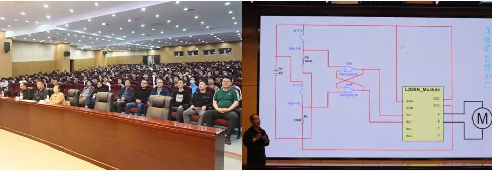 会议伊始,蔡陈赟从参考资源、题目介绍、参赛人员及赛事安排四方面进行细致深入的讲解。本届“我的第一件科创作品”大赛除了延续上一届的无线试电笔、自动往复小车、光敏开关报警器等传统题目外,同时创新了电子幸运转盘等题目,旨在进一步增强学生实践能力及创新能力。